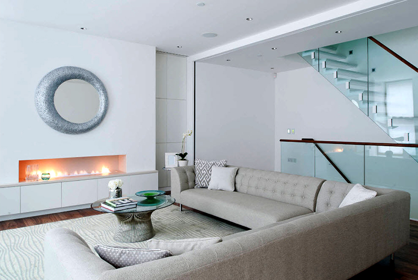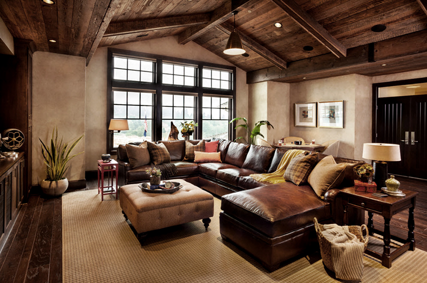 Colocar los muebles en diagonal le permite animar el aspecto de una sala de estar sin rostro. Lo principal es que el sofá no crea obstáculos para el movimiento de personas. En los salones con chimenea, la atención se centra en este elemento. En este caso, el lugar para instalar el sofá esquinero se elige con mucho cuidado. Los muebles se pueden usar para zonificar una habitación y crear un área de chimenea, u oponerlos a una fuente de fuego instalándolos contra una pared opuesta.