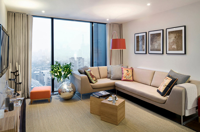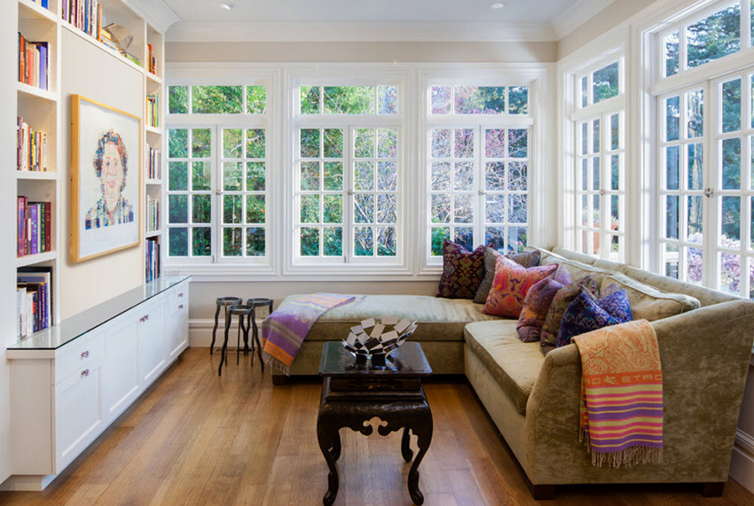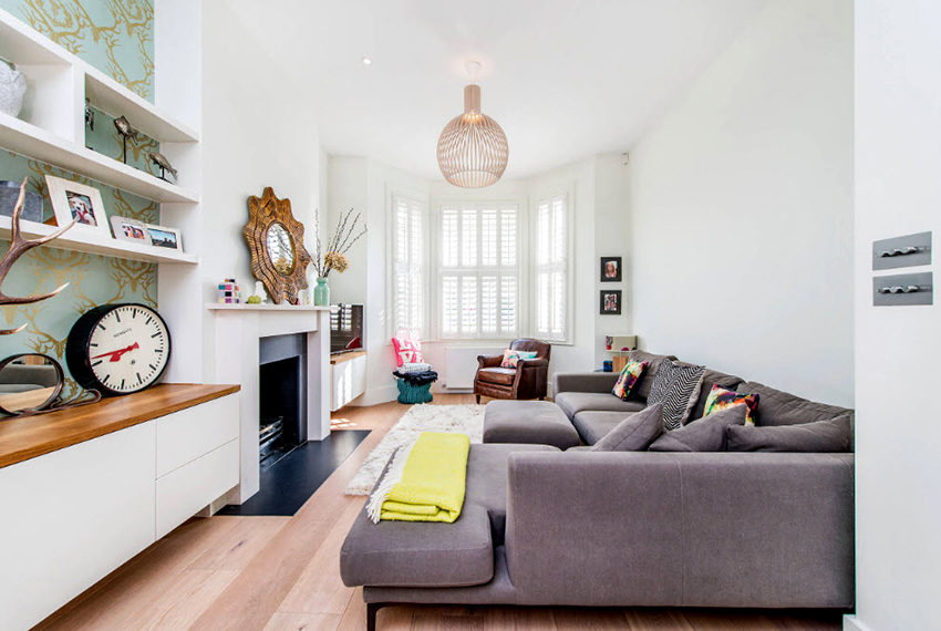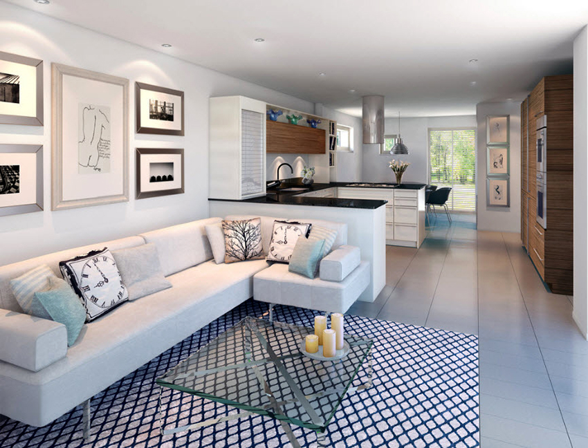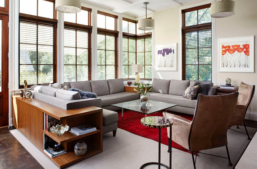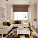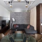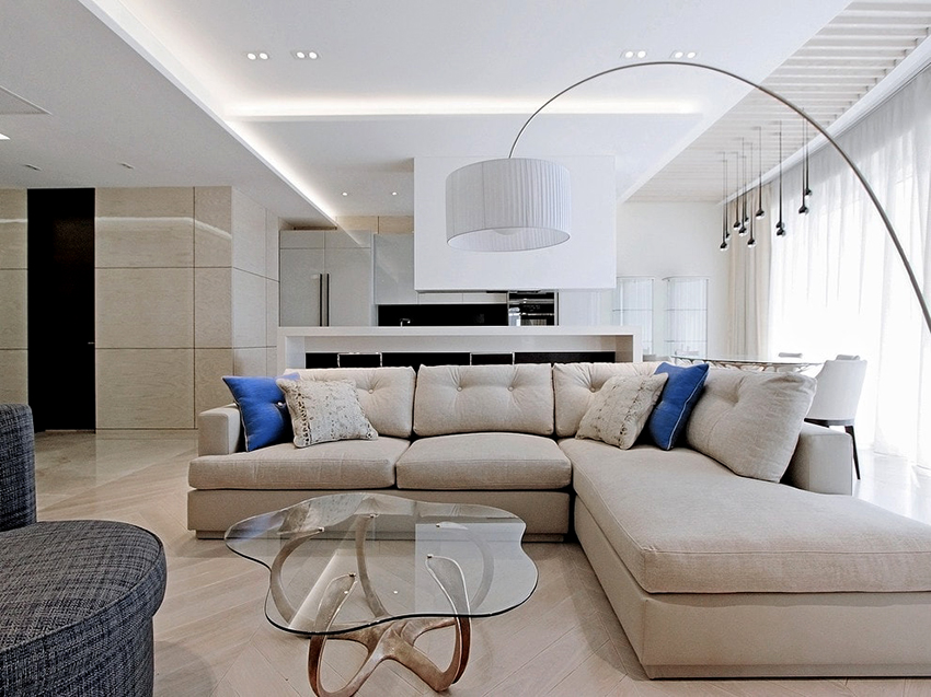 El modelo en forma de L, instalado en la esquina, ahorra tanto espacio como sea posible en una sala de estar cuadrada y crea una gran cantidad de asientos. Los sofás con esta configuración también son aplicables para la zonificación del espacio. Si el apartamento no tiene un vestíbulo de entrada y la puerta de entrada conduce directamente al pasillo, puede crear un área para invitados con la ayuda de muebles de esquina. Como resultado, la parte trasera del sofá forma una especie de pasillo.