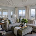 Un sofá de esquina se verá bastante atractivo en combinación con una gran planta vertical. La maceta se puede colocar detrás de la parte posterior de la estructura. Además, la planta se puede vencer eficazmente utilizando iluminación oculta y crepúsculo. Es interesante en el interior de la sala de estar que establece, que consta de un sofá y un reposapiés con tapizado suave, mira. Si el tamaño de la habitación lo permite, esta composición se puede complementar con un sillón.