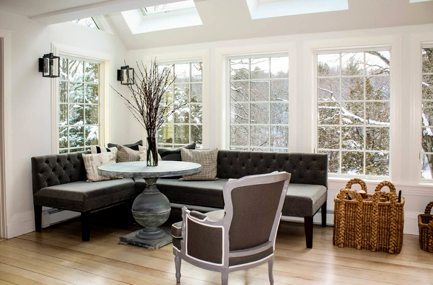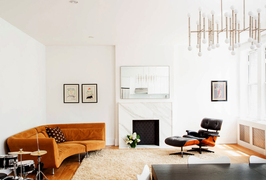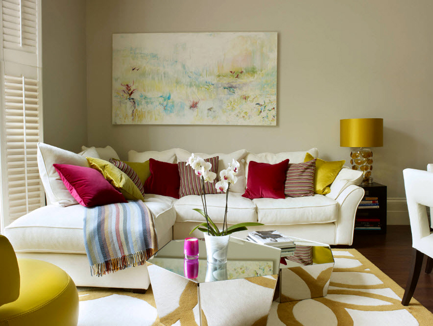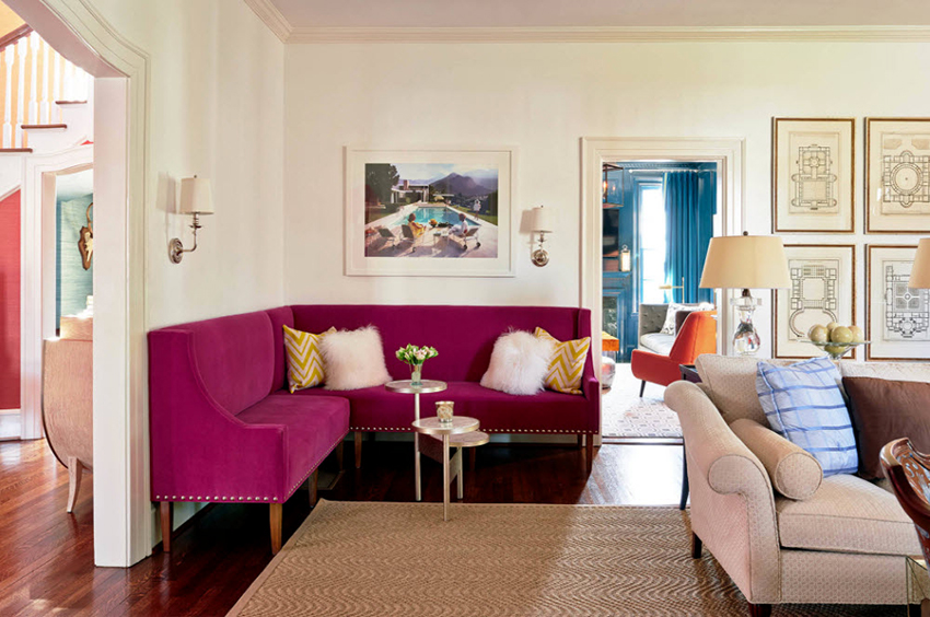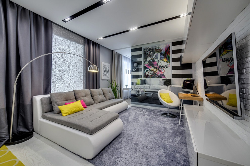Para una habitación con un acabado monocromático claro, puede comprar un sofá espectacular brillante