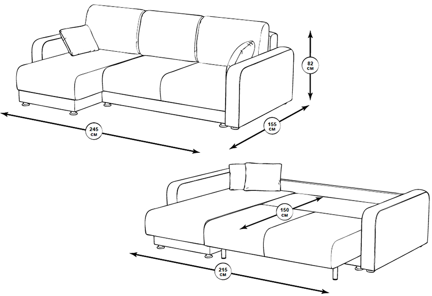 Las construcciones con el mecanismo de transformación Dolphin tienen diferentes tamaños. En su mayoría se trata de sofás de esquina con literas de 160x200, 158x222 y 115x210 cm.