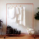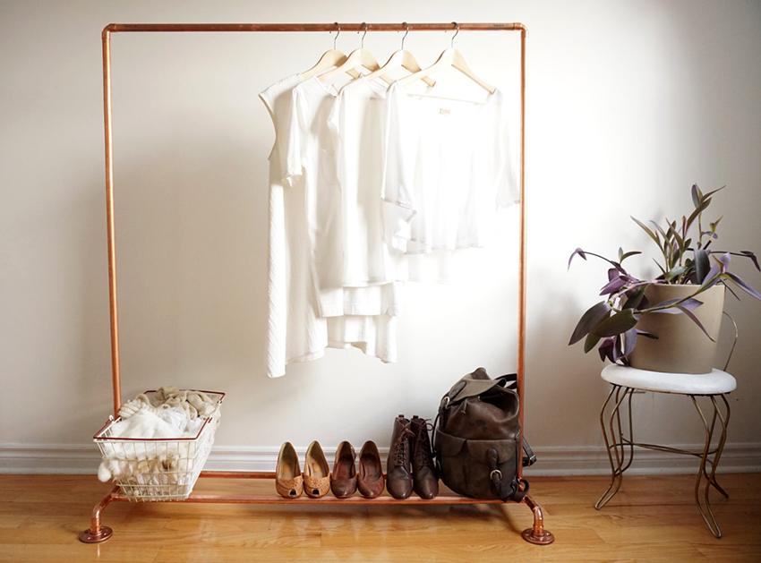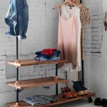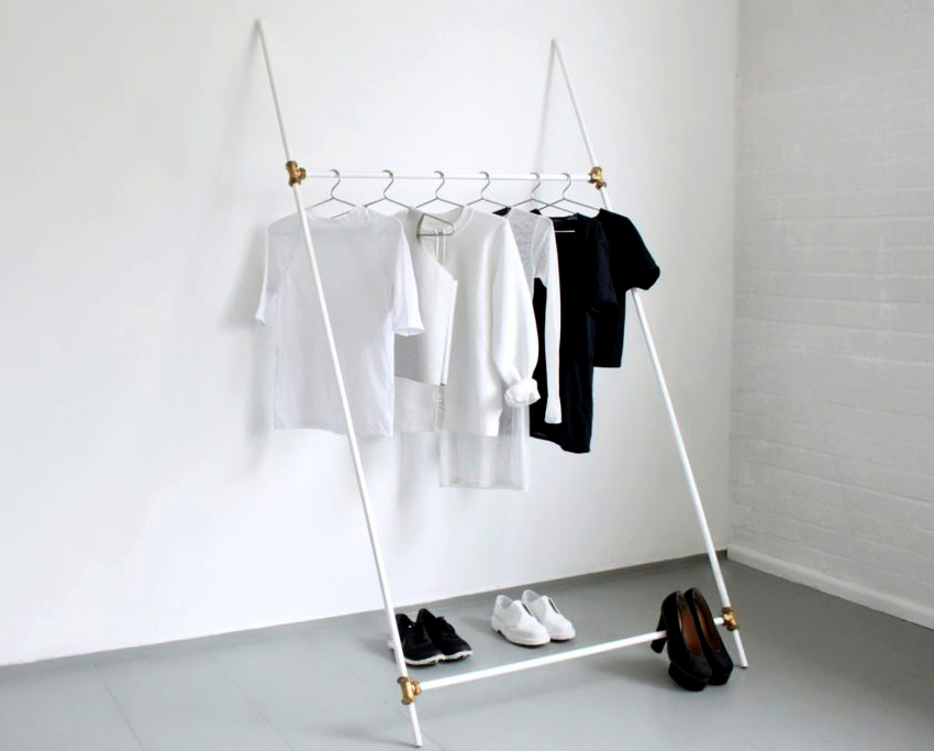 Un colgador de piso para bricolaje hecho de tubos es una opción de diseño simple que ayudará a mantener el orden en cualquier habitación