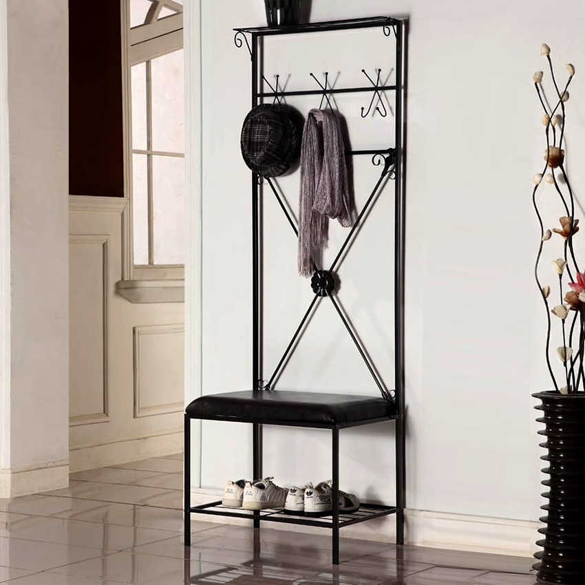 El modelo original es una percha para silla. Como su nombre indica, se asemeja a una silla ancha, que utiliza un perchero con ganchos para ropa como respaldo alto. Por lo tanto, sentado en el asiento, puede ponerse los zapatos de manera segura, y el lugar de abajo sirve para guardar los zapatos. Los ganchos-ganchos se colocan generalmente en una fila en el "respaldo" plano y alto de la llamada silla. Un estante para sombreros puede completar el diseño.