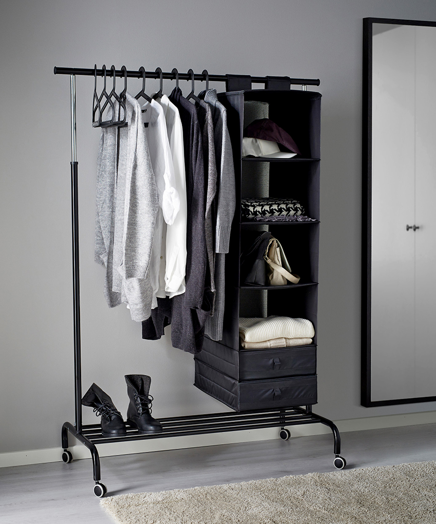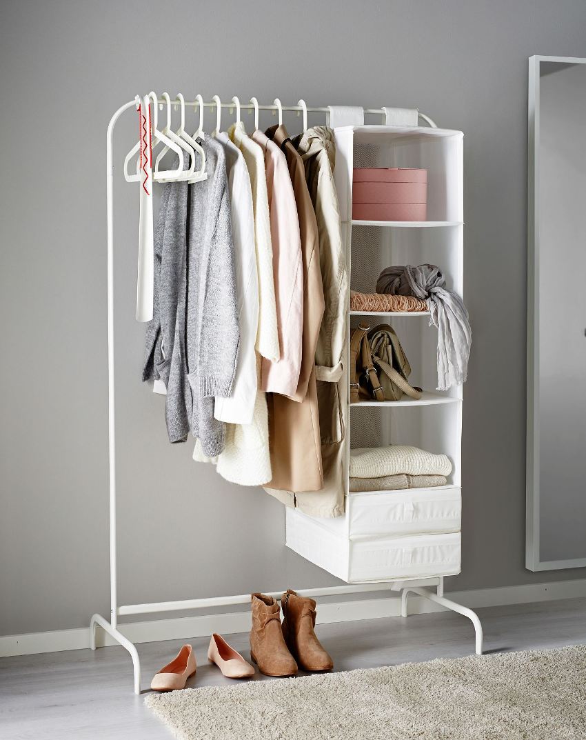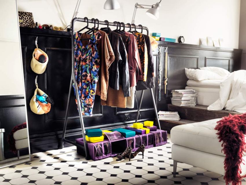 - Compacidad. Debido a sus pequeñas dimensiones, se pueden mover y colocar fácilmente en cualquier rincón apartado. Este es un verdadero hallazgo para apartamentos pequeños. Por ejemplo, un estante para trajes puede reemplazar con éxito un armario voluminoso.