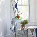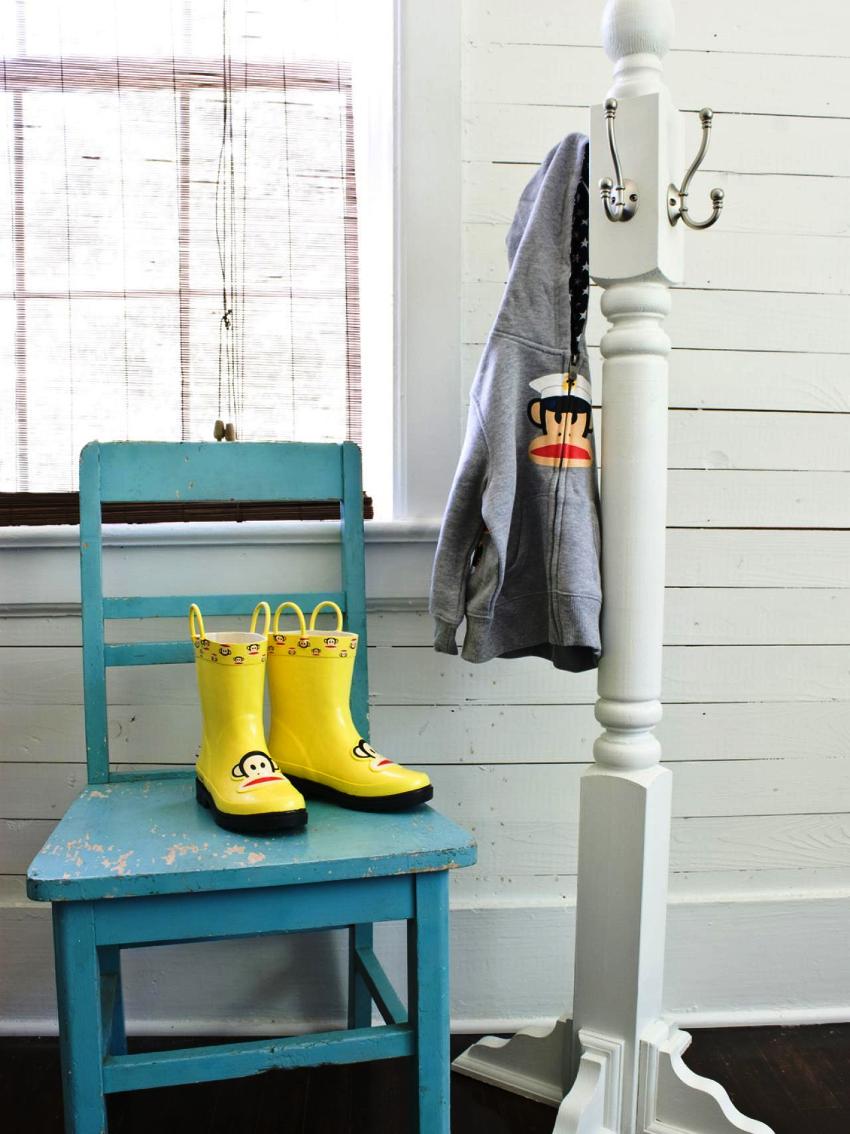 Un viejo arbolito con ramas en el jardín que ha dejado de dar frutos también se puede usar para crear un perchero. Para hacer esto, debe limpiar el tronco y las ramas de la corteza, eliminar el exceso de ramas y ramitas, lijar la superficie, barnizarla y fijarla en la base. Puedes dejar la tonalidad natural de la madera o pintarla del color deseado. Para agregar romance, el modelo debe estar decorado con hojas y flores artificiales. A los niños les gustará especialmente este accesorio. Para crear una percha tipo traje, puede usar una silla vieja y un ariete sin gancho.