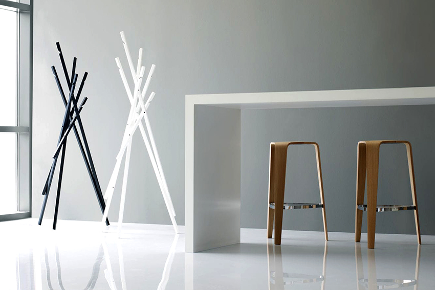 El colgador de piso de cierto diseño encajará perfectamente en casi cualquier interior de la habitación