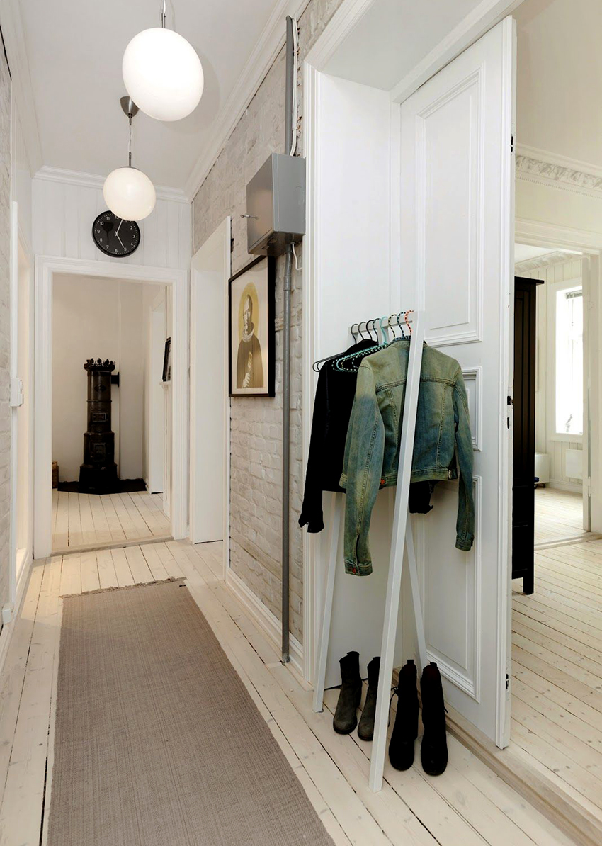 En un pasillo ecléctico, las soluciones de diseño no estándar y los modelos exclusivos son bienvenidos, por ejemplo, estilizados para varias formas. Los colores prioritarios son el blanco, el negro o una combinación de ellos, pero también son aceptables los modelos brillantes que se convertirán en un acento en el interior. El colgador de suelo blanco se adapta a casi cualquier diseño. Se verá especialmente armonioso en el estilo escandinavo, así como en el campo y el desván.