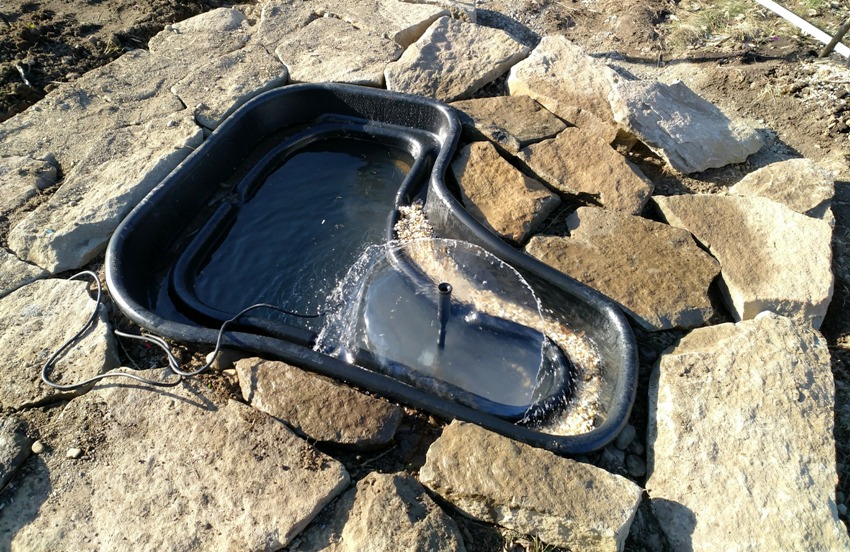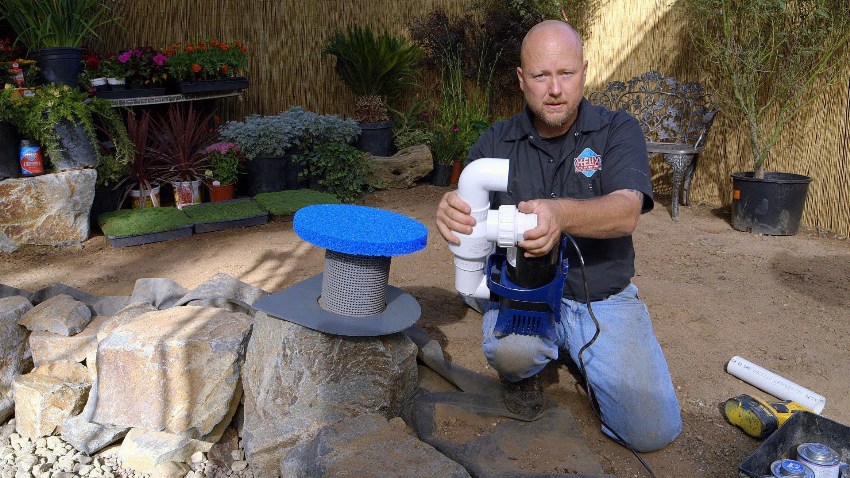 La bomba sumergible para la fuente está montada sobre una almohada de ladrillo o un pedestal de plástico.