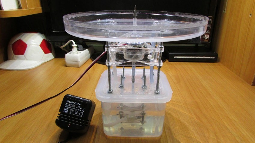 A través de la plantilla, también se hacen agujeros en la tapa del recipiente de plástico, que es el depósito de agua. En el orificio central de la placa superior es necesario insertar un pequeño segmento de 40-50 cm de largo desde la varilla del bolígrafo de gel, que actuará como sello de aceite y cojinete al mismo tiempo.