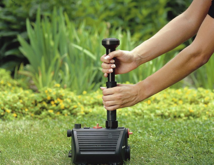 El dispositivo sumergible extrae agua de las capas inferiores del depósito o una fuente externa, seguido de su liberación a través de las boquillas. En la primera versión, la bomba debe estar equipada con un sistema de filtración para evitar atascar el sistema. Se rocía un chorro de agua sobre la unidad. Si el sistema se complementa con una manguera de cierta longitud, el flujo se puede llevar a un lugar específico, que está establecido por la idea del diseño del paisaje. Los tubos se conectan y alargan según el principio telescópico mediante conexiones de goma o plástico.