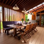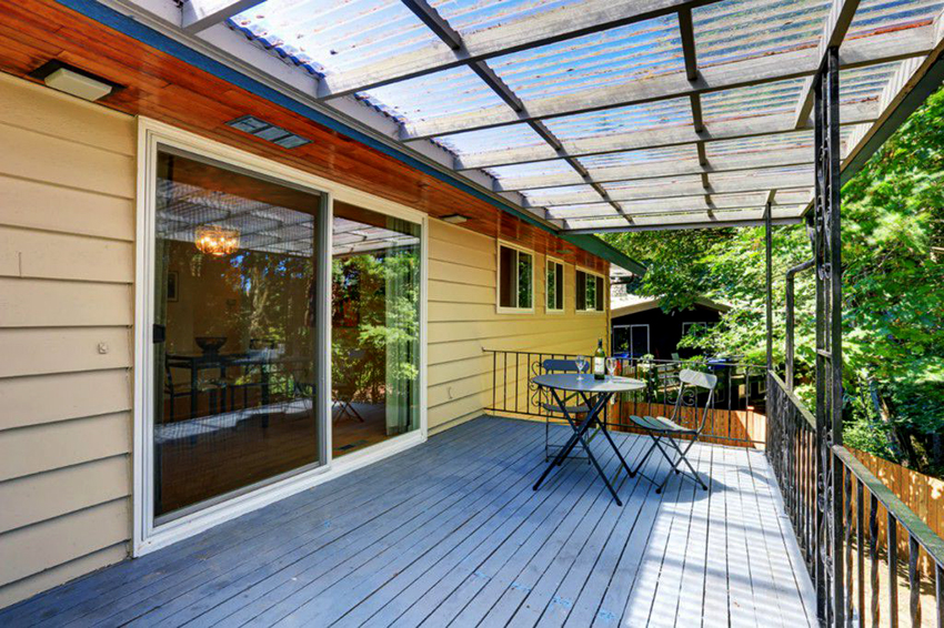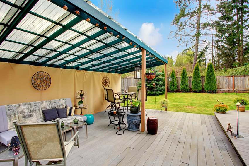 Debajo de un dosel en el jardín, puede colocar un banco, columpio, colocar un cajón de arena o una piscina debajo. Tal estructura, unida al edificio, implica la instalación de muebles: se forma una terraza de verano.