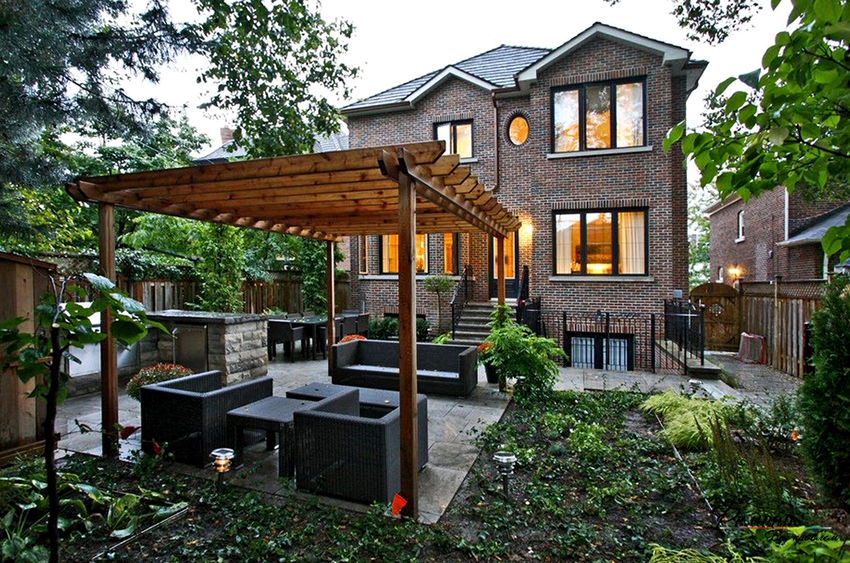 Las opciones de pérgolas que se ofrecen en la foto son bastante adecuadas para utilizar según sus fines. El diseño exterior debe mantenerse de acuerdo con el estilo y el interior debe modernizarse. Una pérgola estacionaria, unida a la casa, teniendo en cuenta los requisitos de proporción, aumenta visualmente el tamaño de la estructura en su conjunto. Si dicha estructura también tiene una caja lateral que cubre parcialmente el espacio, entonces en el verano en esta área puede crear una sala de juegos para un niño. Esto prolongará significativamente su estancia al aire libre.