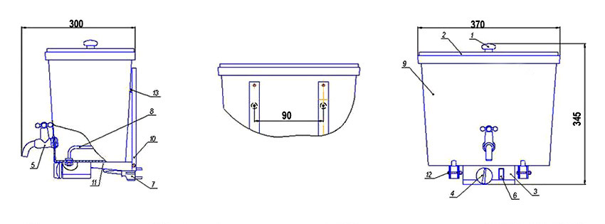 1. Mango de la tapa, 2. Tapa, 3. Unidad de control, 4. Regulador de temperatura, 5. Válvula de bola, 6. Interruptor de llave, 7. Cable, 8. Elemento calefactor, 9. Tanque de agua, 10. Soporte de pared, 11. Soporte soporte, 12. Tornillo, 13. Bujes