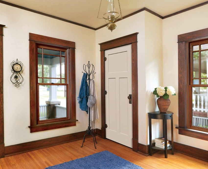 Es posible decorar la entrada no solo con el uso de capiteles y cornisa, también son posibles otras opciones de decoración. El más popular son los adornos de puertas tallados. Como se puede ver en la foto, las molduras de las puertas con tallas son tiras de madera que pueden ser de forma plana o convexa, pero con los característicos bordes redondeados, que están decorados con un patrón tallado en madera.