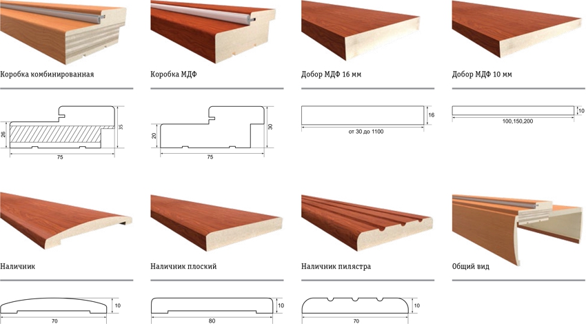 El ancho del cobro también depende de su forma. Los modelos planos cumplen con el estándar de 64 mm mencionado anteriormente. Los productos con una superficie en forma de semicírculo tienen 70 mm de ancho. Para las tiras rizadas que difieren en la superficie de relieve, está permitido instalar plataformas anchas en puertas con dimensiones que oscilen entre 85 y 150 mm.