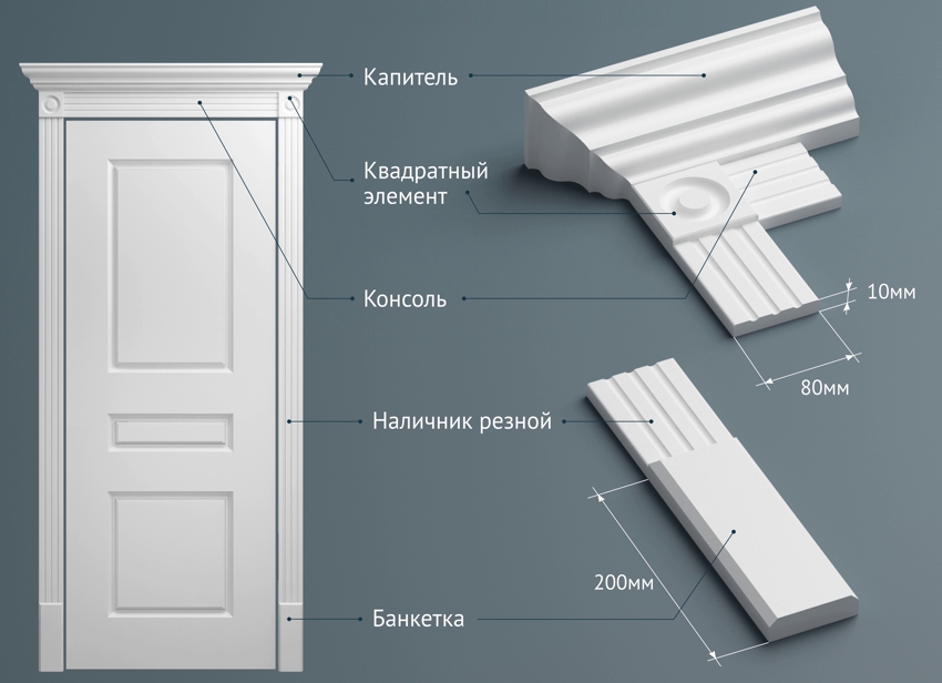 Además de decorativos, los capiteles también realizan una serie de funciones adicionales, en particular, aumentan visualmente la altura de la puerta, impartiendo así solidez y alto costo a toda la estructura. Se instalan principalmente desde el lado de la entrada a la casa, y en el medio, a la salida, prescinden de ellos. Externamente, la capital parece una columna de la antigüedad. Las superposiciones ubicadas en la parte superior de las planchas verticales forman una única composición.