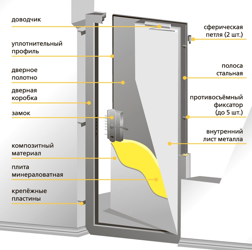 - Puertas estándar.Están equipados con cerraduras de tercera clase (no inferiores) y pasadores anti-removibles;