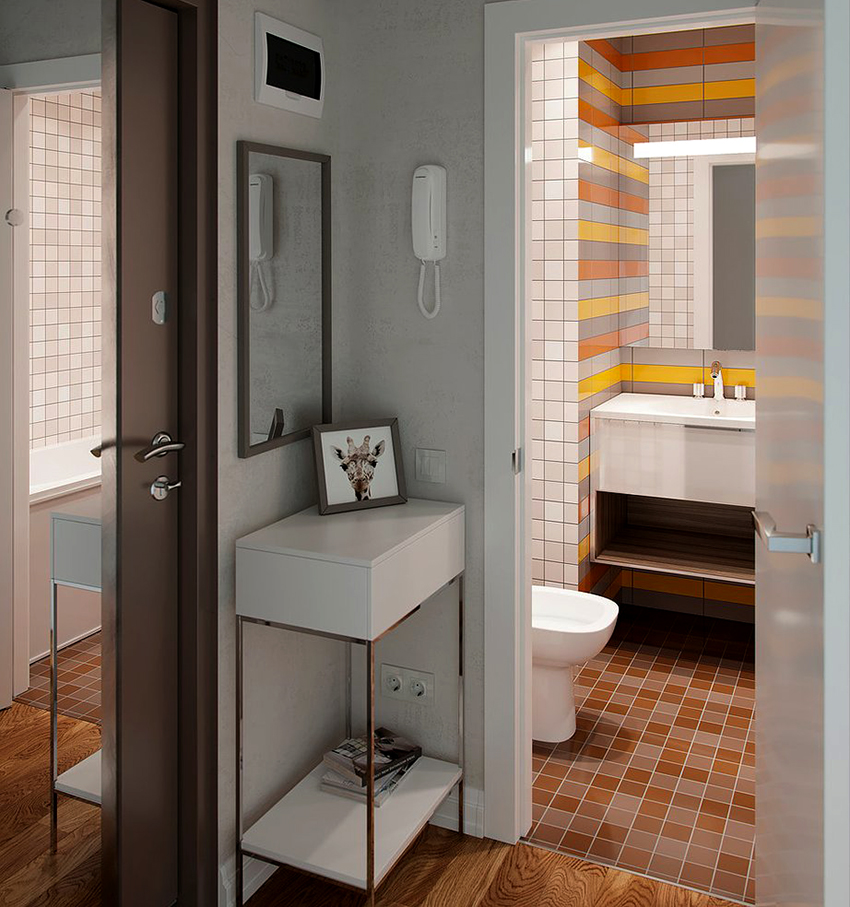 Un espejo en la puerta de entrada no solo es una solución práctica, sino también un elemento de diseño adicional