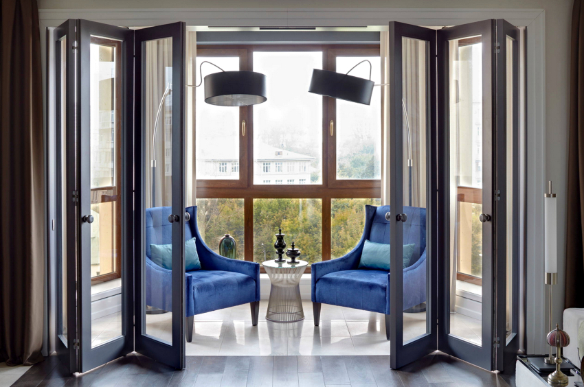 El mecanismo de apertura plegable permite que la hoja de vidrio se pliegue en un acordeón o un libro. Esto se debe a la presencia de un eje vertical a lo largo de las bisagras. Tal diseño requiere un área de estacionamiento donde las puertas se ensamblarán en el momento en que se abran, como se muestra en la foto del acristalamiento de la logia y el balcón.