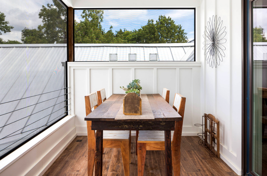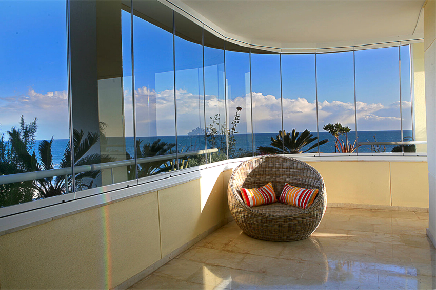 El vidrio duradero puede soportar cargas de hasta 370 kg, por lo que no debe temer que se agriete si te apoyas en él. El sistema sin marco es resistente a condiciones climáticas adversas. Incluso un granizo fuerte no puede dañarlo. El diseño único y el mecanismo de apertura permite que las puertas se deslicen hacia un lado, dando acceso al espacio abierto, como se ve en la foto de los balcones acristalados.