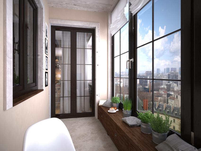 El acristalamiento de un balcón, una logia con una salida, proporciona una expansión interna del espacio debido a la eliminación de la estructura fuera del parapeto. En este caso, es importante calcular correctamente la carga creada por el marco, que debe distribuirse uniformemente sobre la placa de soporte y el parapeto. Se debe instalar un marco liviano. Este es el enfoque más racional para una logia estrecha. Las flores se pueden colocar en el alféizar extendido.