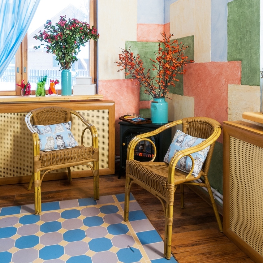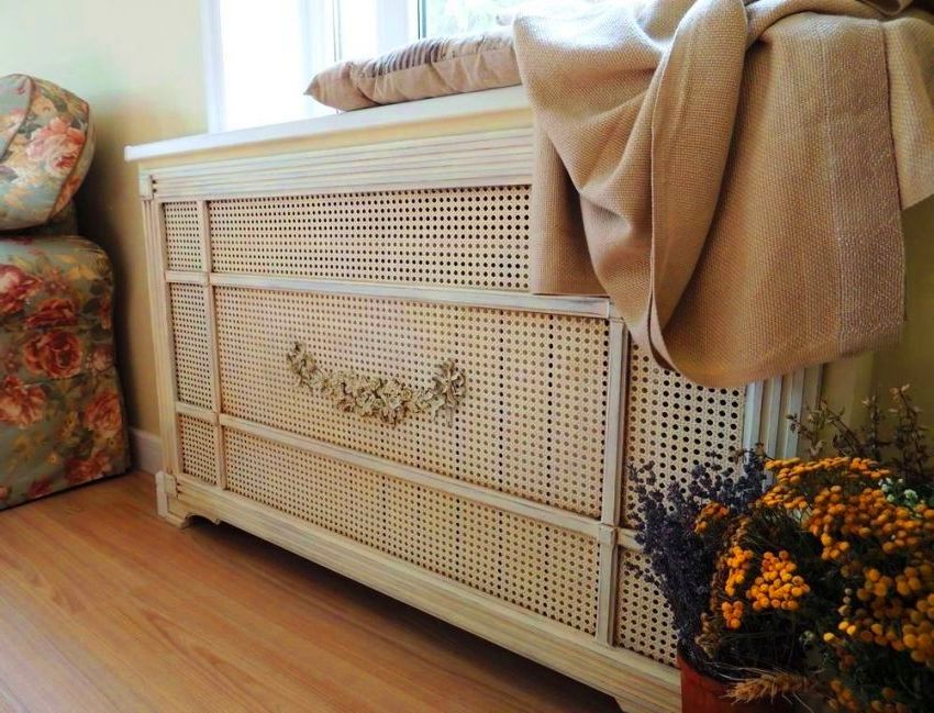 Las pantallas de madera se pueden recubrir con esmalte, barniz, teñir o pintar. Las rejillas decorativas de mimbre se ven bien, lo que se muestra claramente en la foto de las pantallas decorativas para calentar radiadores. Es mejor elegir productos recubiertos con una composición de tinte a base de agua sin impurezas dañinas para excluir la posibilidad de que se evaporen y entren en el aire de la habitación cuando se calienta la estructura.