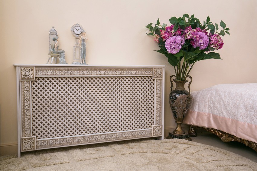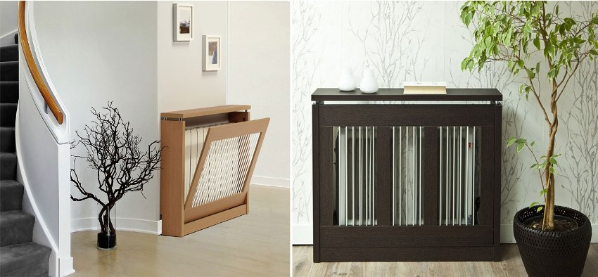 Las opciones más comunes son de madera. rejillas decorativas en la batería... Los productos se distinguen por su respeto al medio ambiente, buena calidad y apariencia presentable. Las pantallas de alta calidad hechas de especies de madera caras como el roble y la haya se convertirán no solo en una protección confiable para los radiadores, sino también en una decoración inusual para el interior de una habitación decorada en un estilo clásico o rústico.