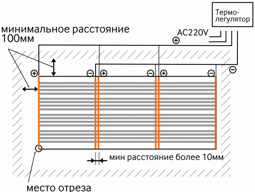 Para evitar errores de instalación y otras sorpresas, los expertos aconsejan, antes de instalar la película IR, elegir un esquema de conexión y elaborar un plan de proyecto. Un diagrama elemental ayudará no solo a calcular correctamente la cantidad de material, que es necesaria en un caso particular, sino también a seleccionar la película necesaria en términos de potencia.