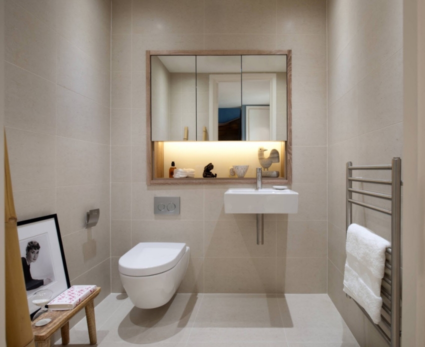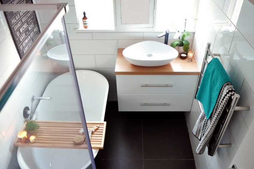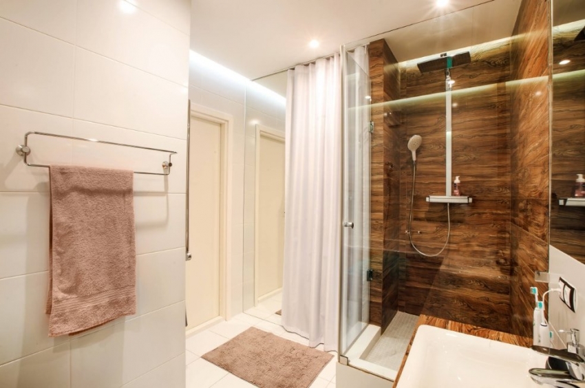 A primera vista, tal medida puede parecer injustificada, pero de hecho, este método es muy efectivo incluso para baños pequeños. Teniendo en cuenta el hecho de que la pérdida de espacio utilizable no supera un total de 0,2-0,5 m², y el interior se mejora significativamente visualmente debido a esto, se puede decir que vale la pena considerar una solución de este tipo.