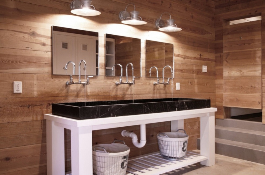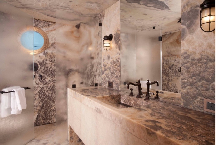 Particularmente popular es el azulejo, que está diseñado para imitar no solo materiales naturales. Cada vez más a menudo puede encontrar mosaicos de fotos, que con razón se llaman una plataforma sin fin para la imaginación. Después de todo, puedes aplicar absolutamente cualquier dibujo que te guste. Con esta tecnología, incluso el baño más común puede crear un hermoso jardín o una isla desierta en el océano. Cuál será la imagen del baño depende de las preferencias de los propietarios.