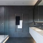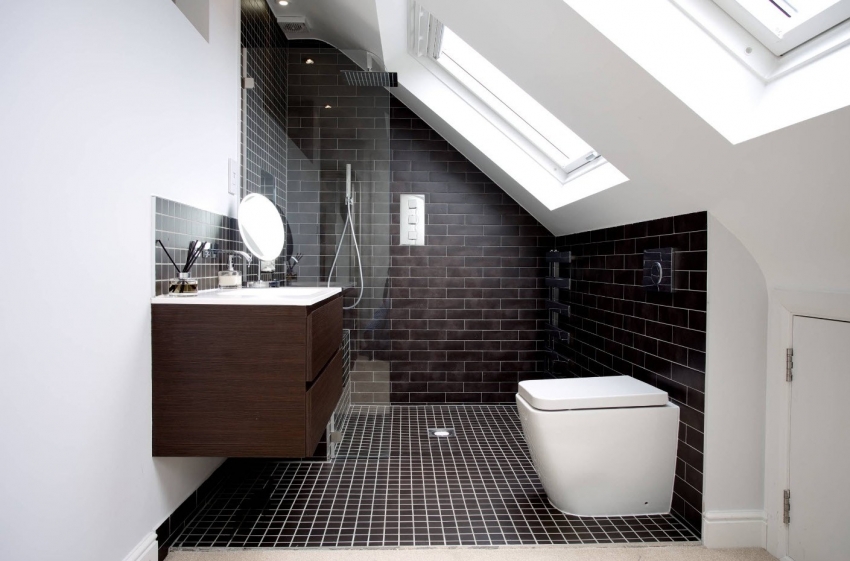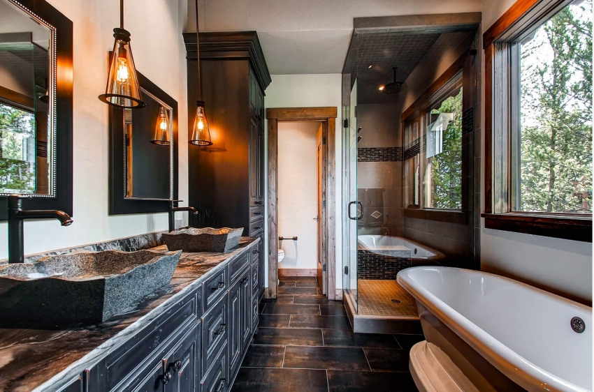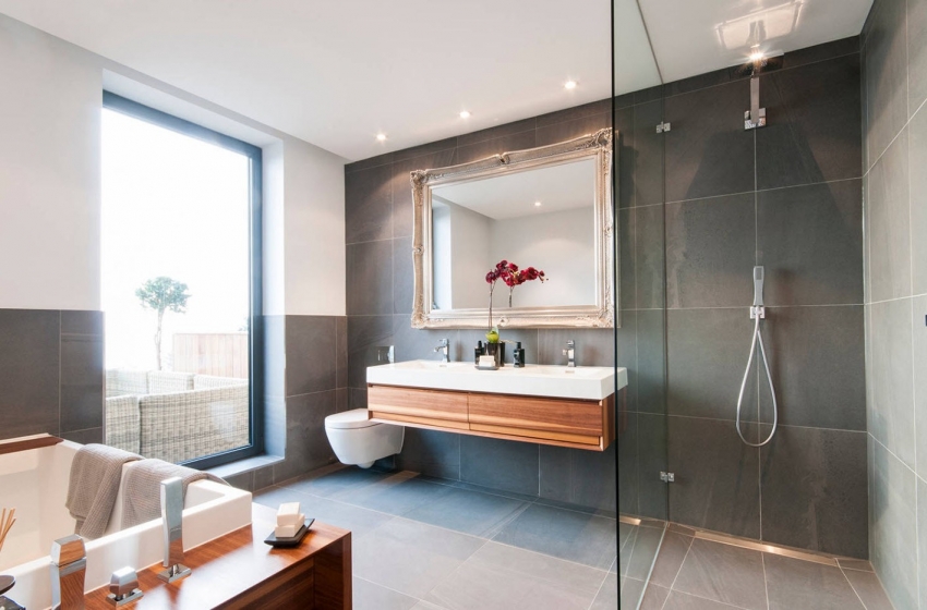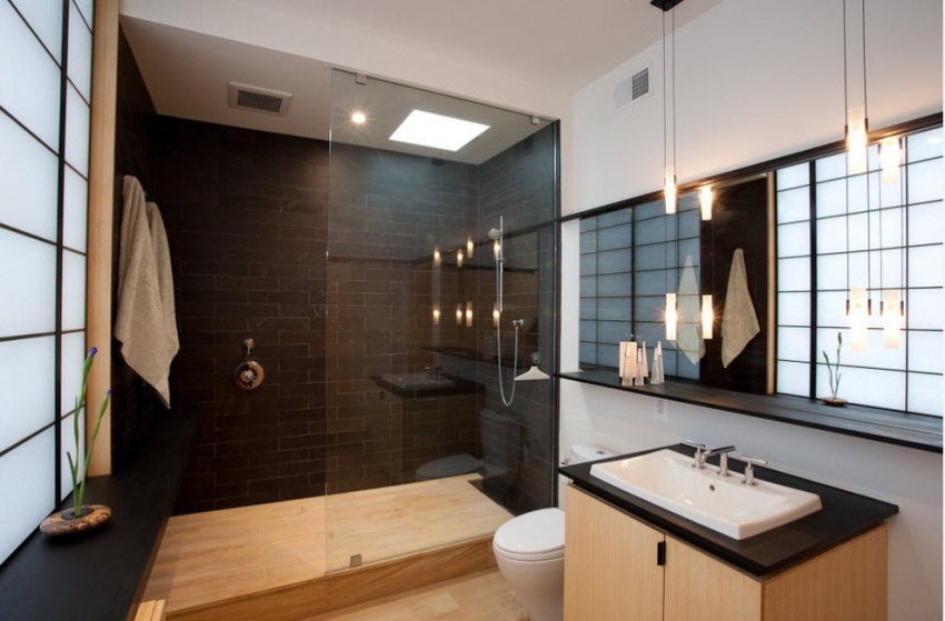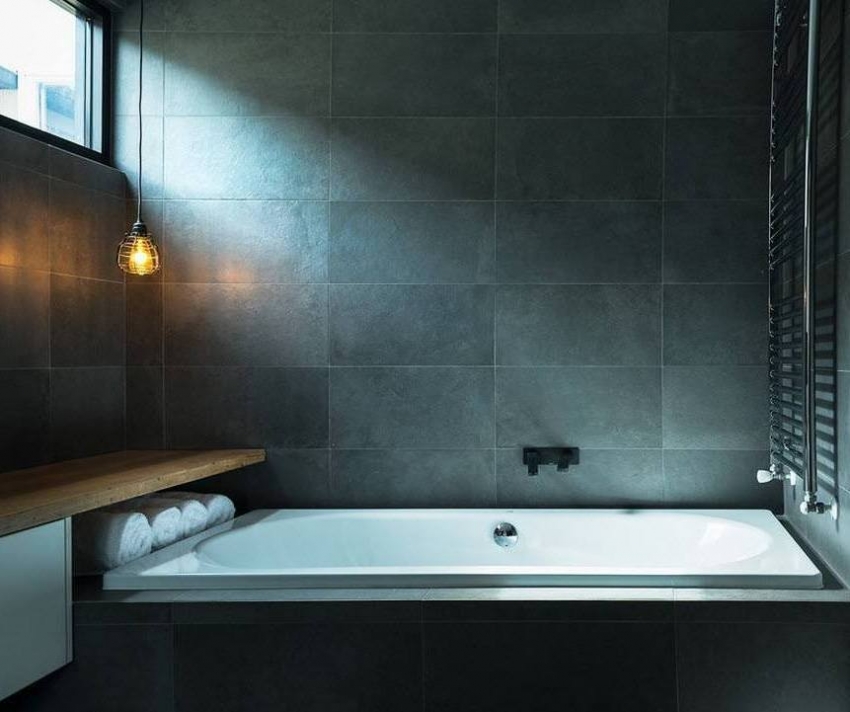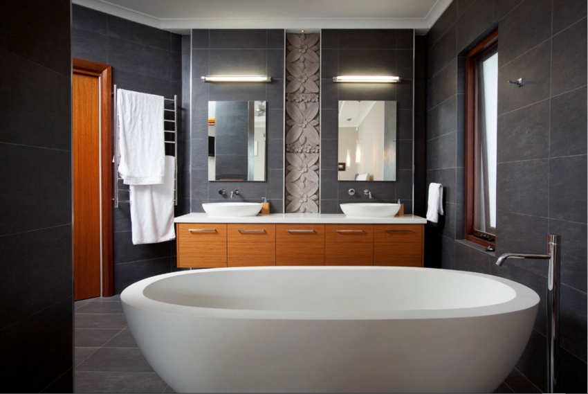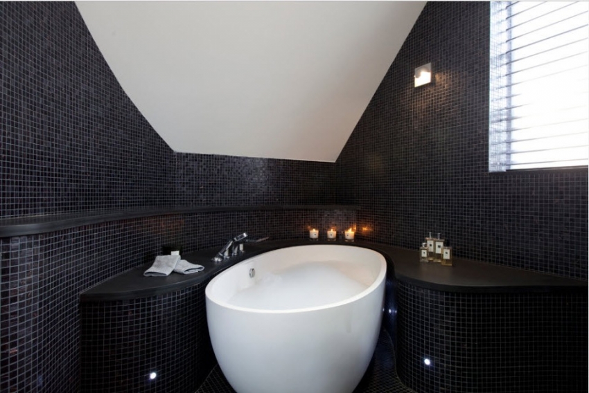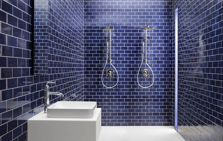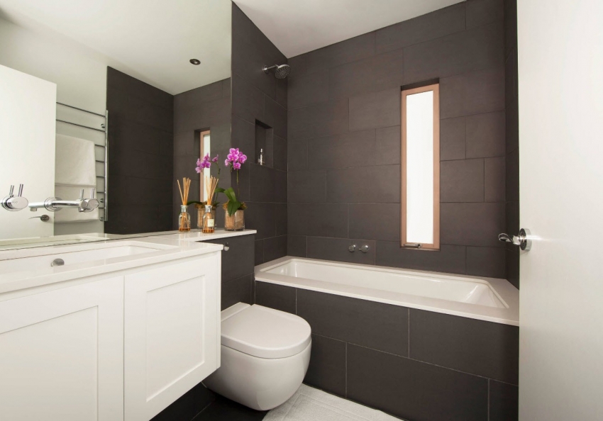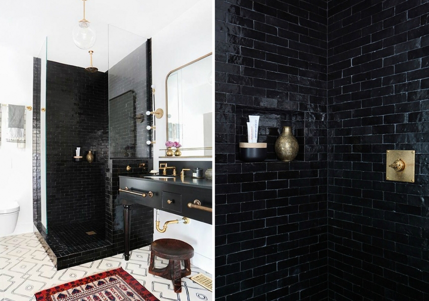 Los azulejos en ricos tonos oscuros se utilizan a menudo para la decoración del baño por los diseñadores modernos.