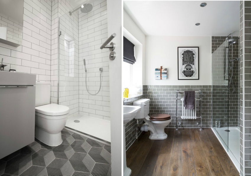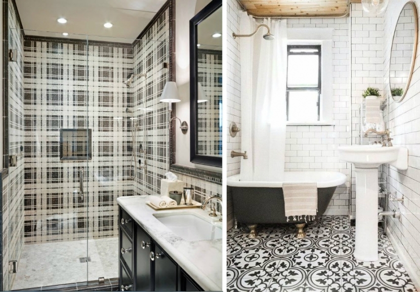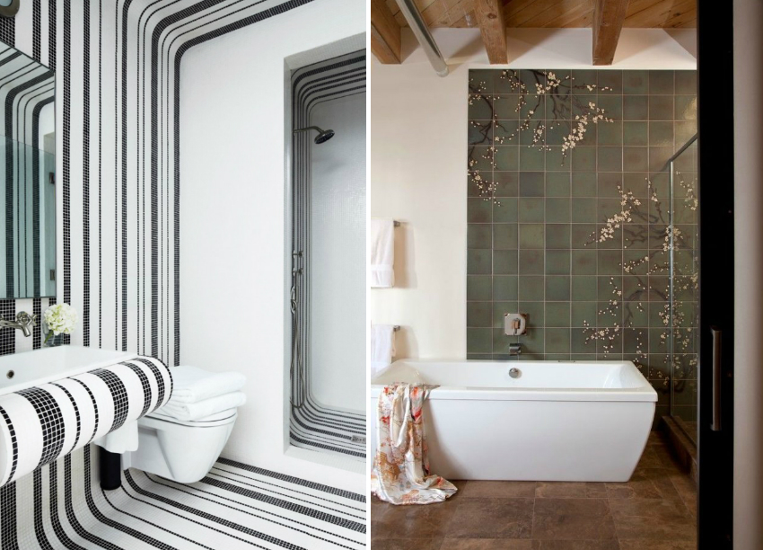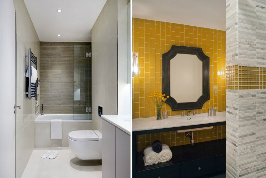 Tipos de baldosas cerámicas utilizadas para el diseño de baños. Fotos de objetos terminados en varios estilos.