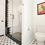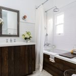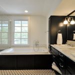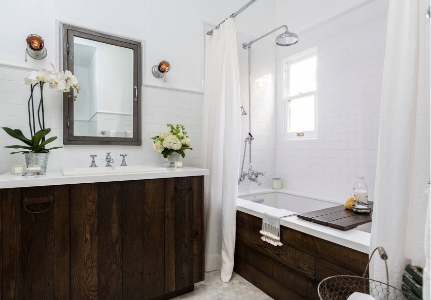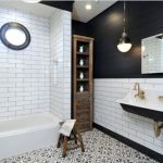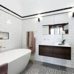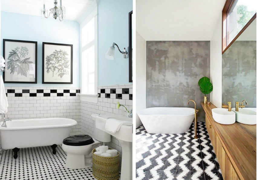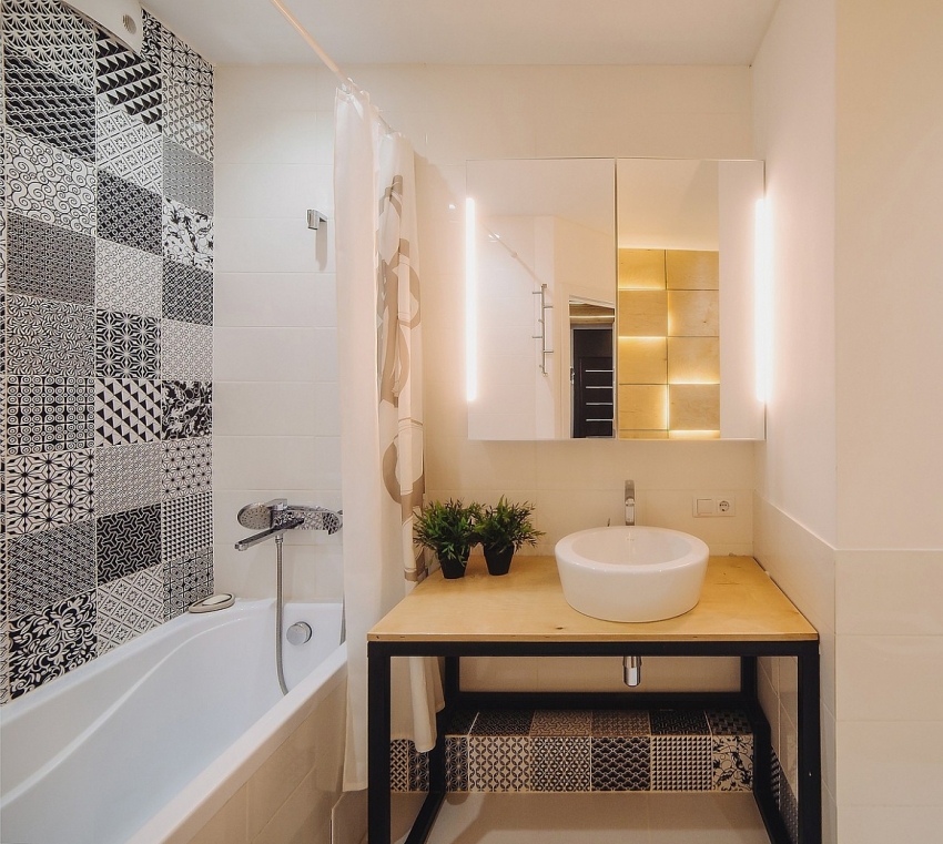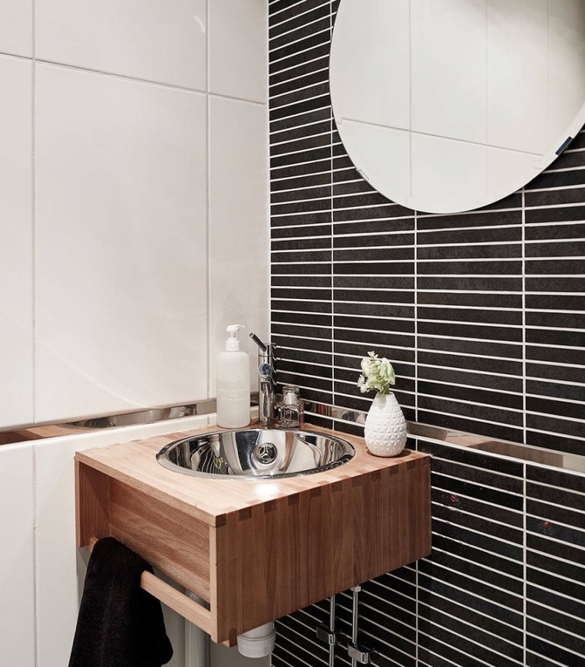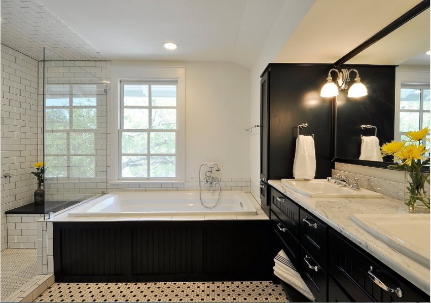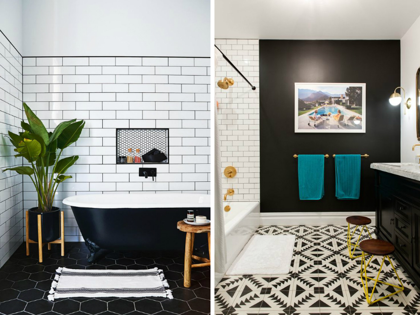 Un ejemplo de la combinación adecuada de azulejos blancos y negros y materiales cálidos para crear un diseño acogedor baño interior