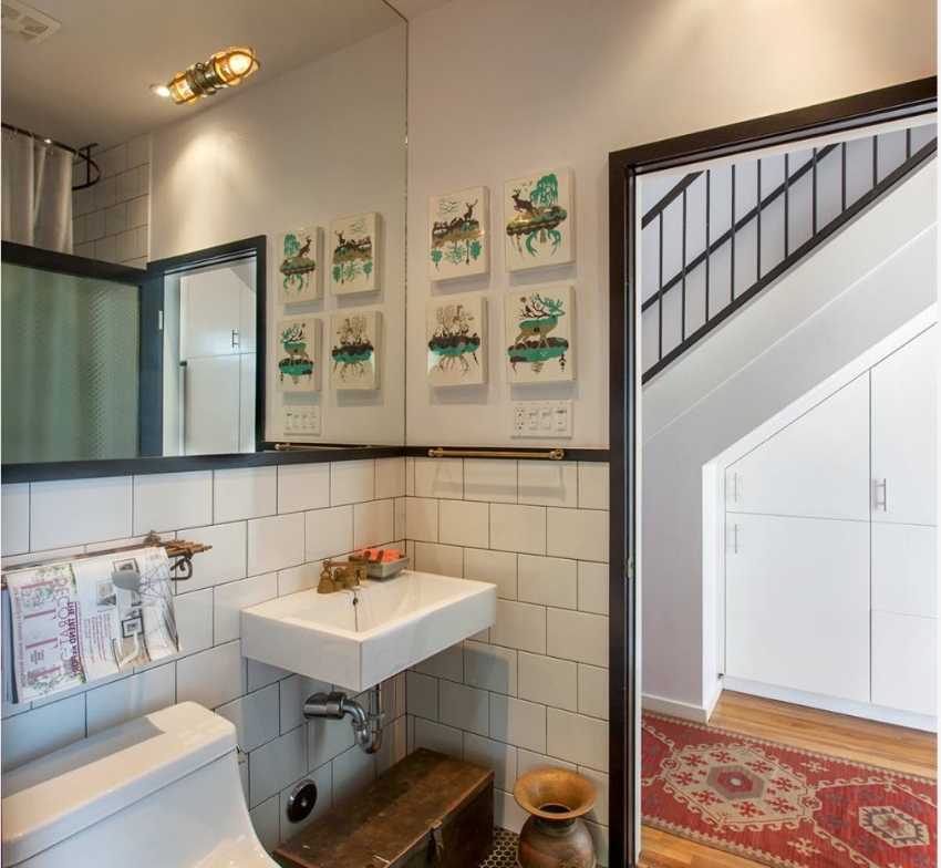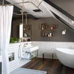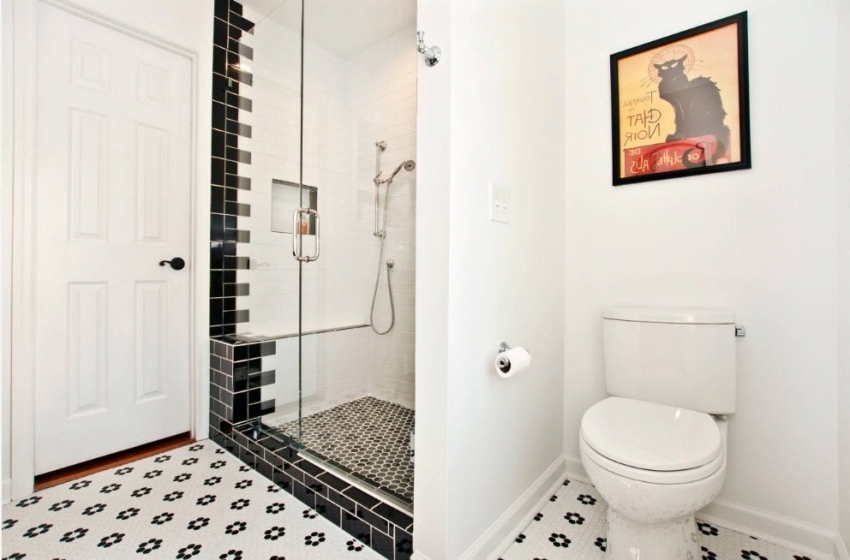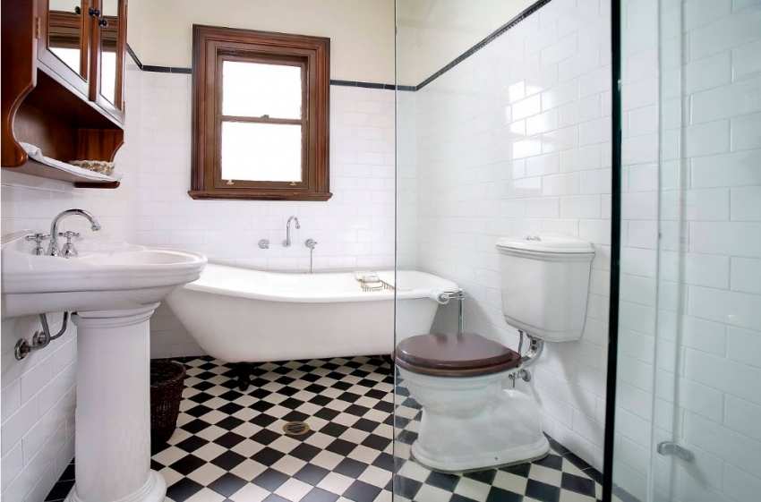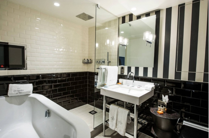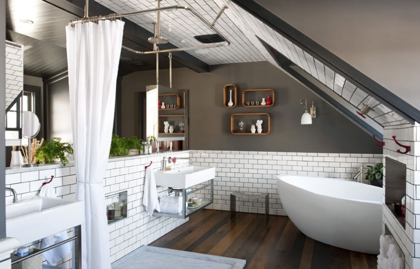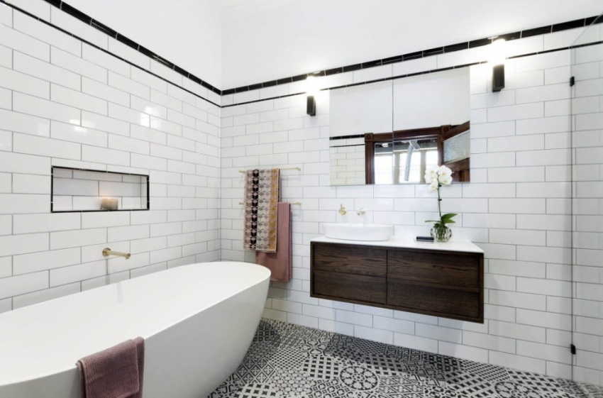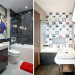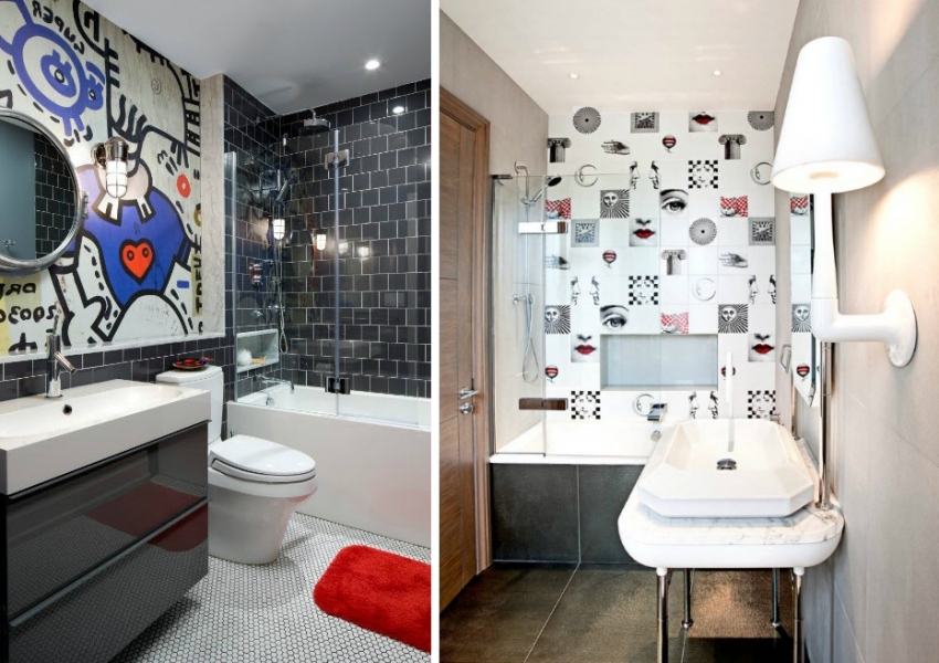 Decora el interior baño en un estilo moderno, puede utilizar los azulejos originales para la decoración de paredes