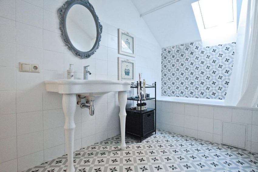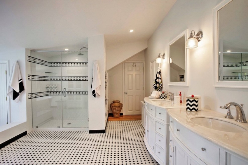 Las baldosas en el baño se utilizan muy a menudo como suelo. Al mismo tiempo, el método de instalación se elige principalmente clásico, teniendo en cuenta solo algunas adiciones. Entonces, si estamos hablando del diseño de un baño en el que se instala una cabina de ducha, las baldosas se colocan en toda la superficie del piso, comenzando desde el centro. Si, en lugar de una ducha, se instala un baño, entonces el espacio se divide en dos zonas, para cada una de las cuales se determina su propia línea central.