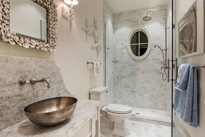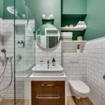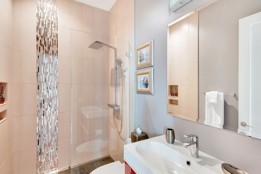 Para decorar un baño pequeño, vale la pena usar pequeños mosaicos, que se pueden enfatizar con la ayuda de elementos de espejo.
