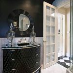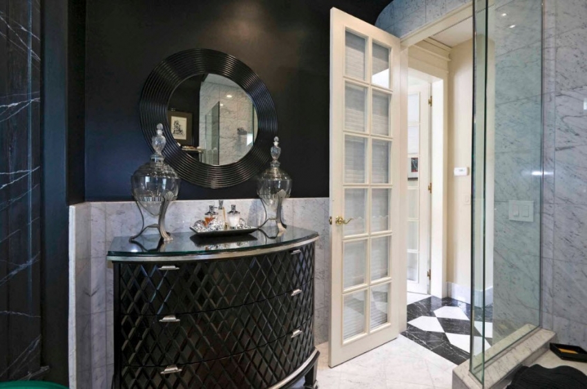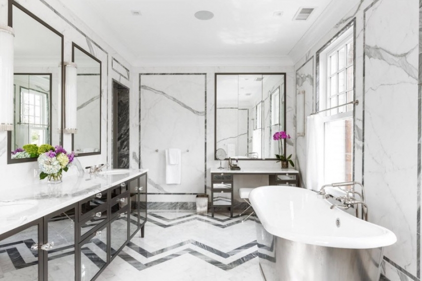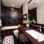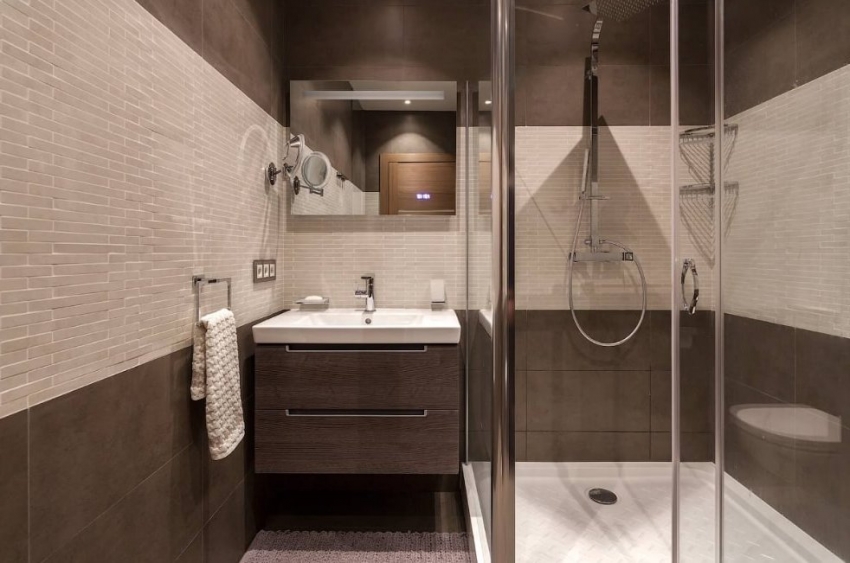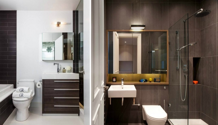 - una combinación de cerámica tradicional y azulejos de espejo. En este caso, las baldosas de color oscuro son las más adecuadas, que actuarán como fondo para inserciones de espejos. Este diseño se ve extremadamente elegante y sofisticado;