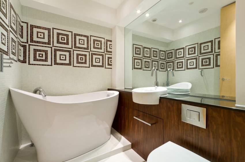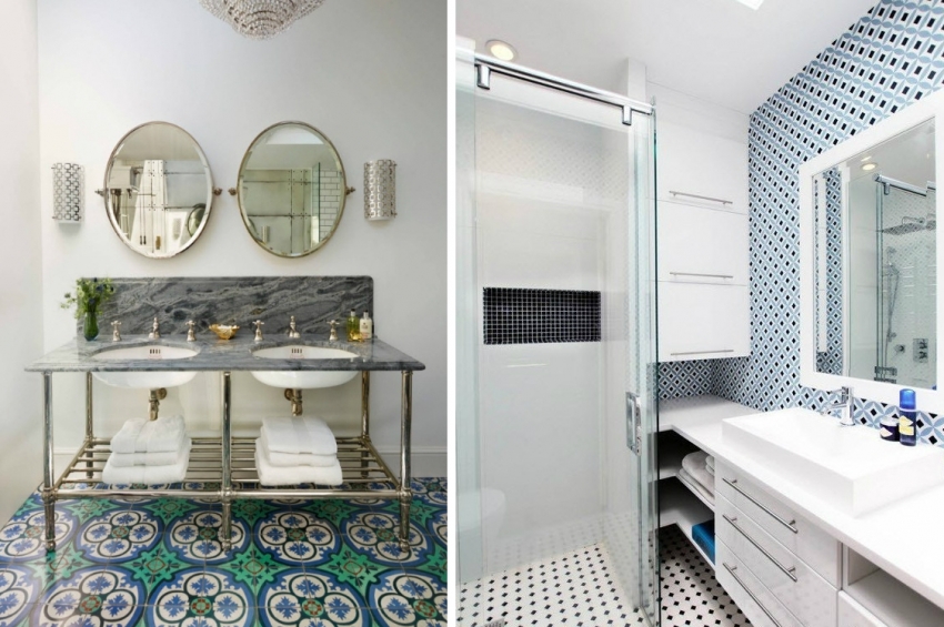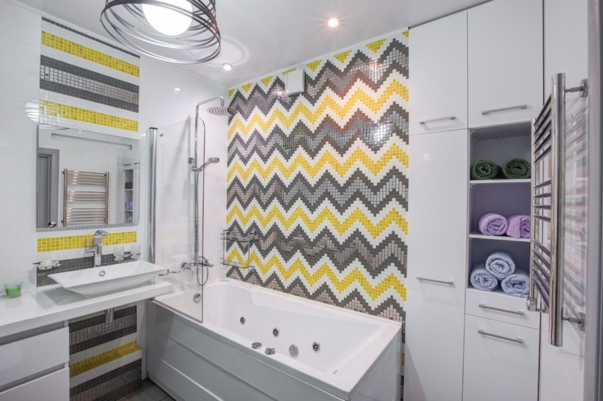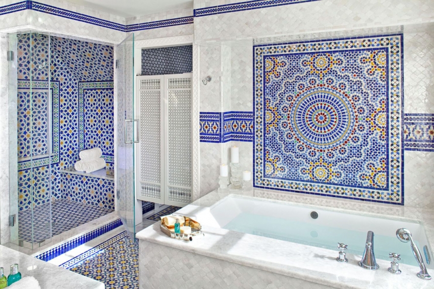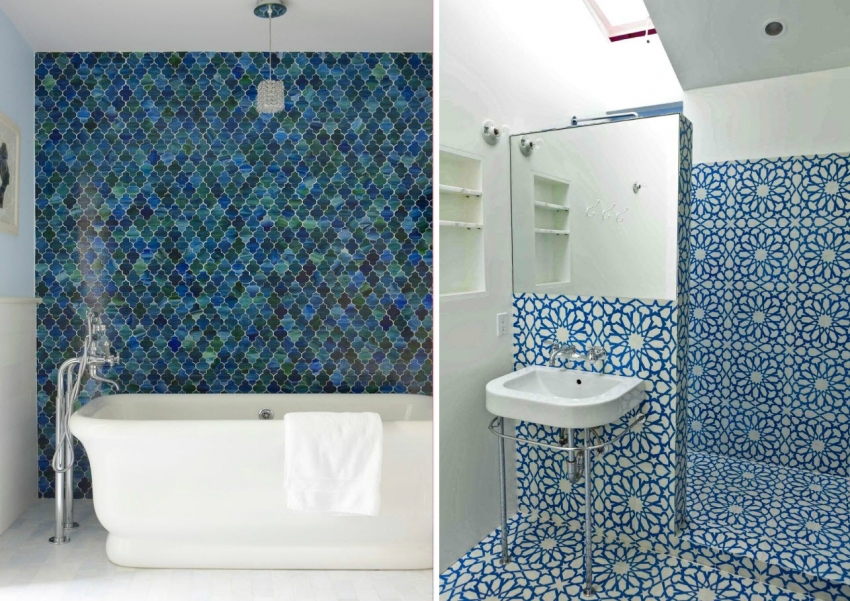 El uso de formas geométricas claramente definidas creadas con mosaicos es aceptable para decorar no todo el baño, sino para acentuar una de las paredes o resaltar arcos, espejos o nichos.