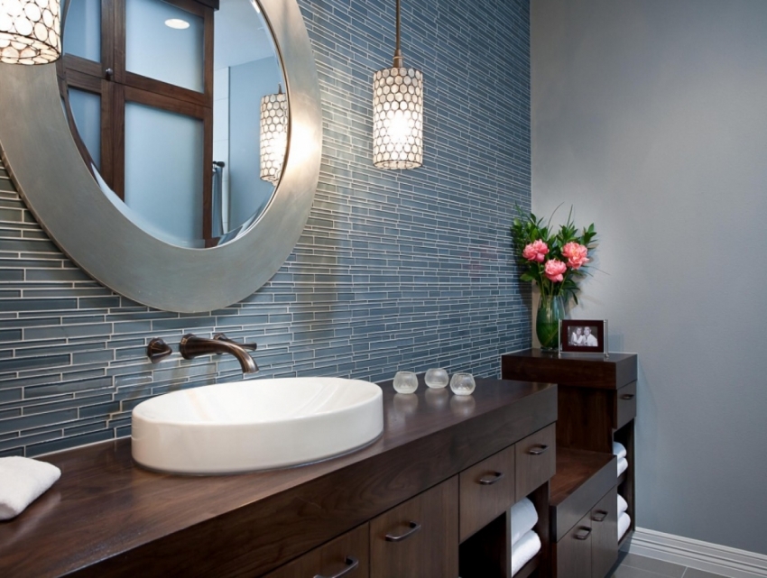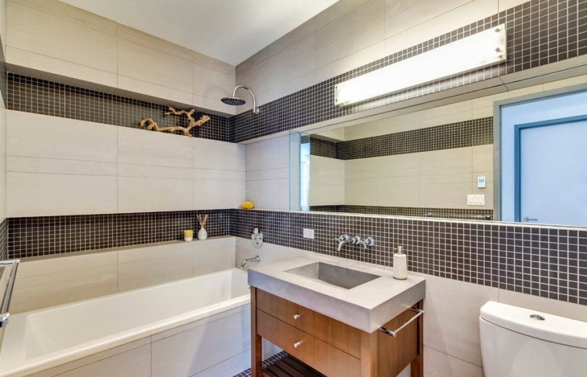 ¡Aviso util!A menudo puede encontrar ideas interesantes para decorar las paredes del baño utilizando varios tonos de azulejos de fondo que se apilan verticalmente. Pero en la práctica, este método no se justifica por sí mismo, ya que muy a menudo la visualización queda parcialmente oscurecida por muebles.