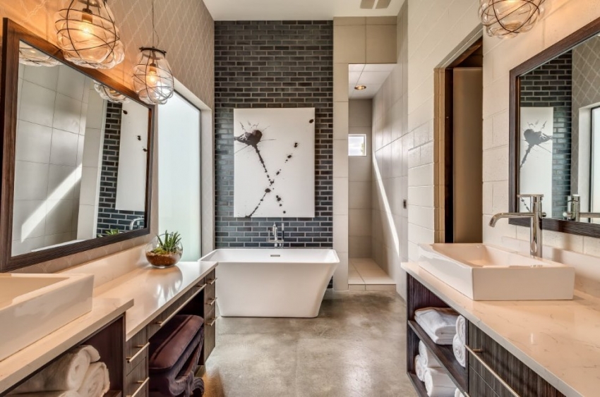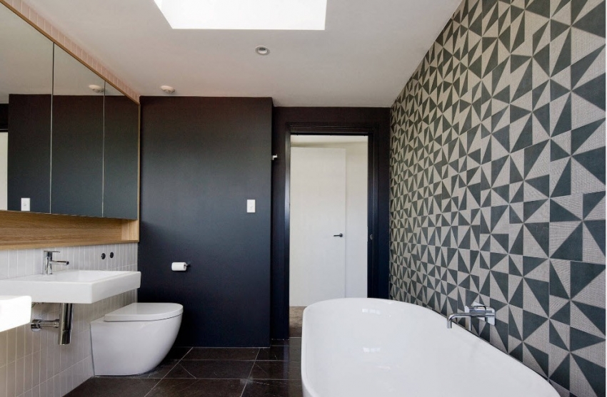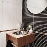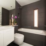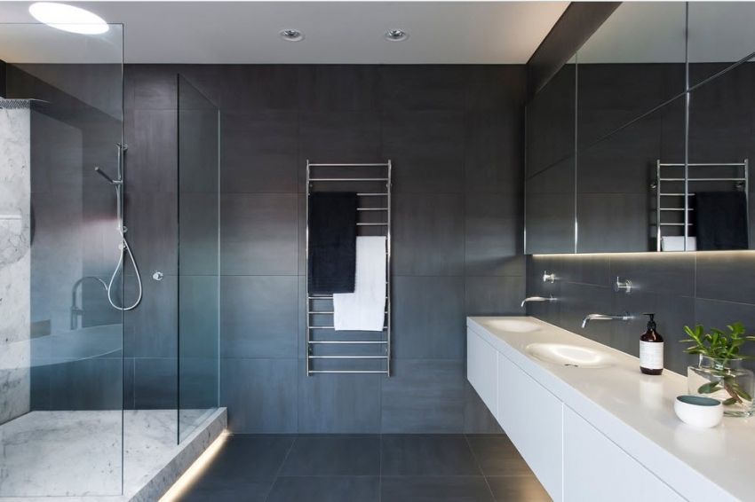 El uso de tonos de azulejos monocromáticos en contraste es una solución bastante popular para decorar interiores de baños modernos.