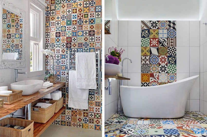 Una de las soluciones más modernas e inusuales es la elección de mosaicos de mosaico. En este caso, consta de elementos individuales con diferentes patrones o tamaños, lo que le permite crear el efecto de una colcha de retazos. Para lograr este efecto, no es en absoluto necesario adquirir kits especiales, que suelen tener un coste considerable. Es muy posible utilizar para esto varios tipos de mosaicos separados que combinen bien entre sí.