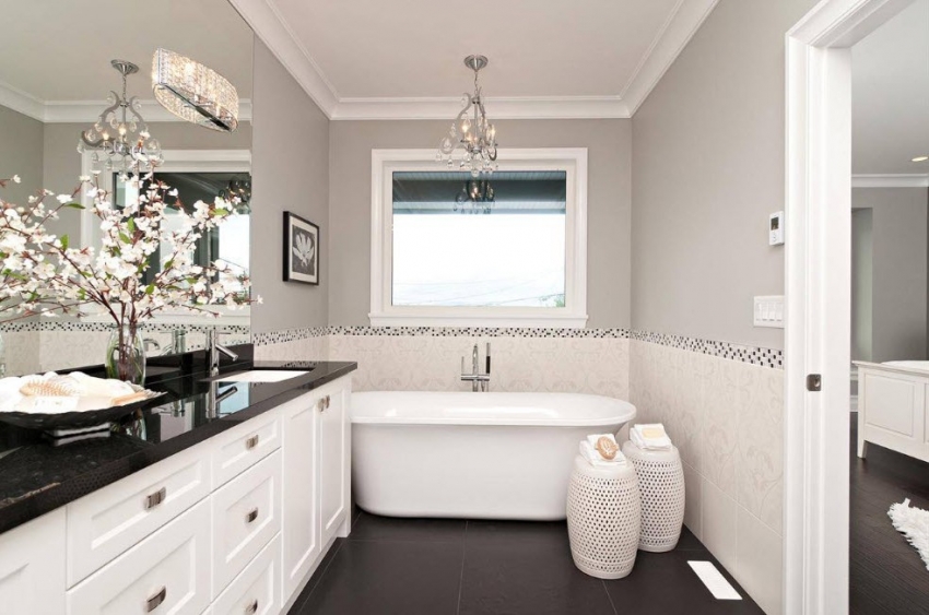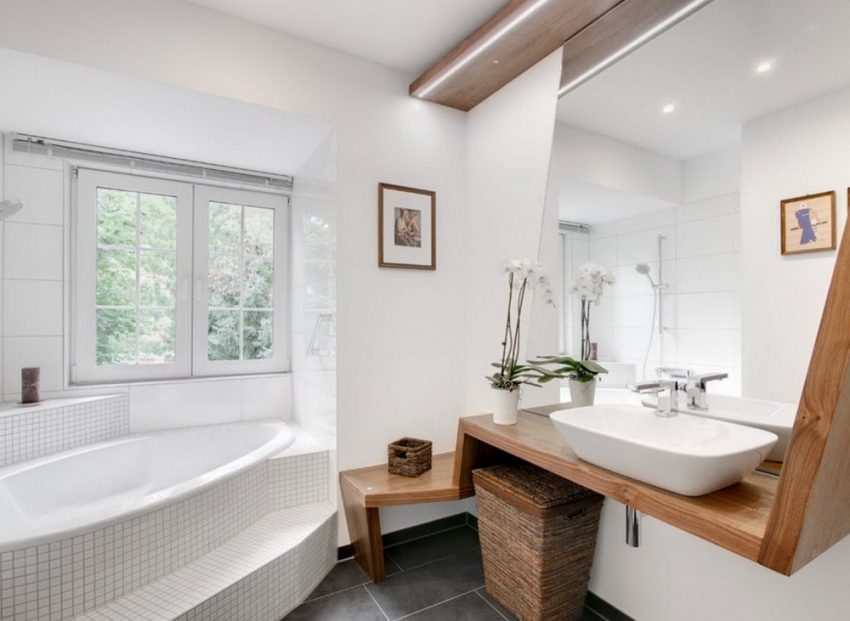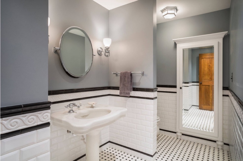 ¡Aviso util!Un bordillo no es la solución adecuada para un baño pequeño. Este elemento es apropiado solo en habitaciones grandes, ya que su propósito es crear un solo cinturón, que en un baño pequeño simplemente estará cubierto por muebles y sanitarios.