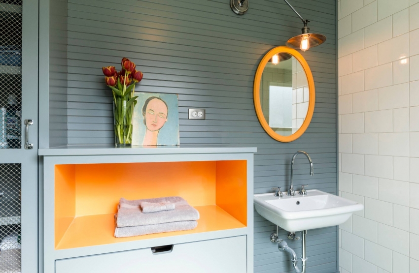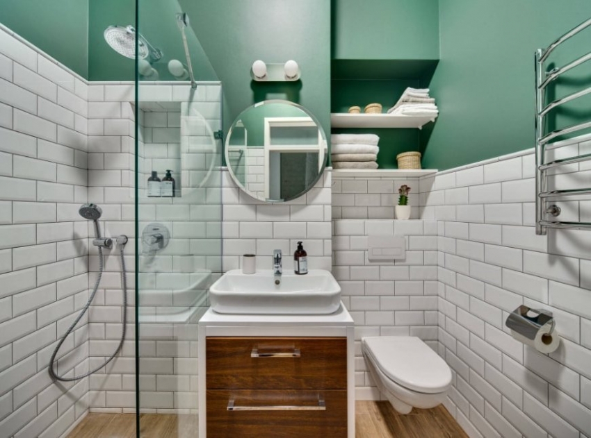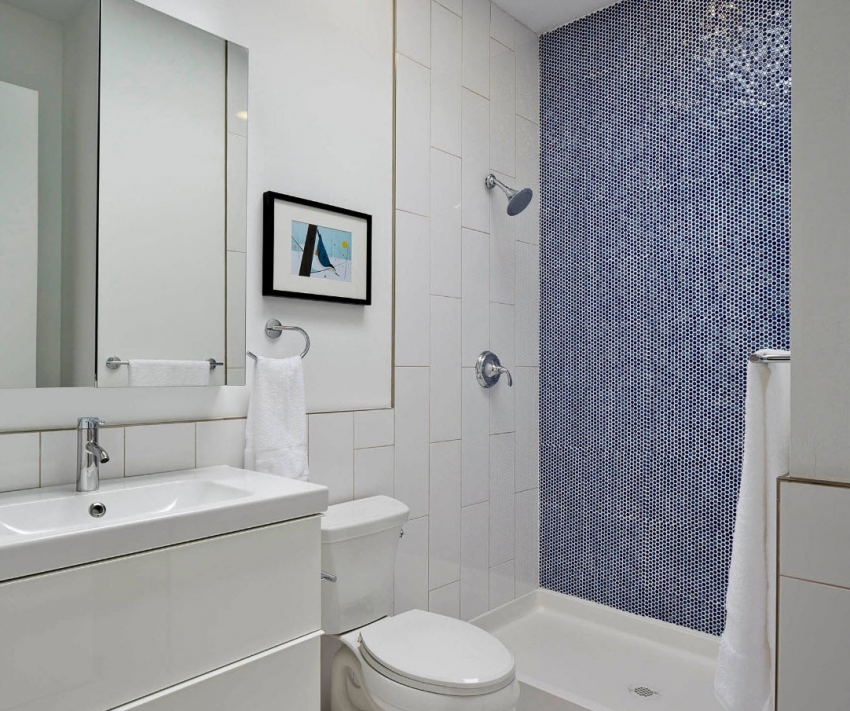 Al colocar baldosas de un color contrastante en una de las paredes, puede profundizar visualmente el espacio del baño