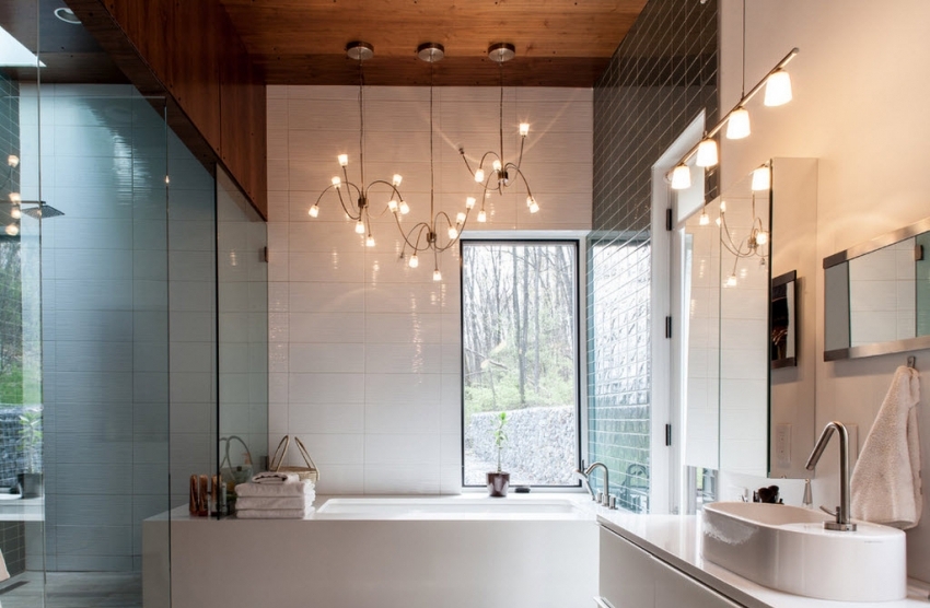 La belleza de las baldosas brillantes en el interior se puede enfatizar con la ayuda de soluciones de iluminación originales.