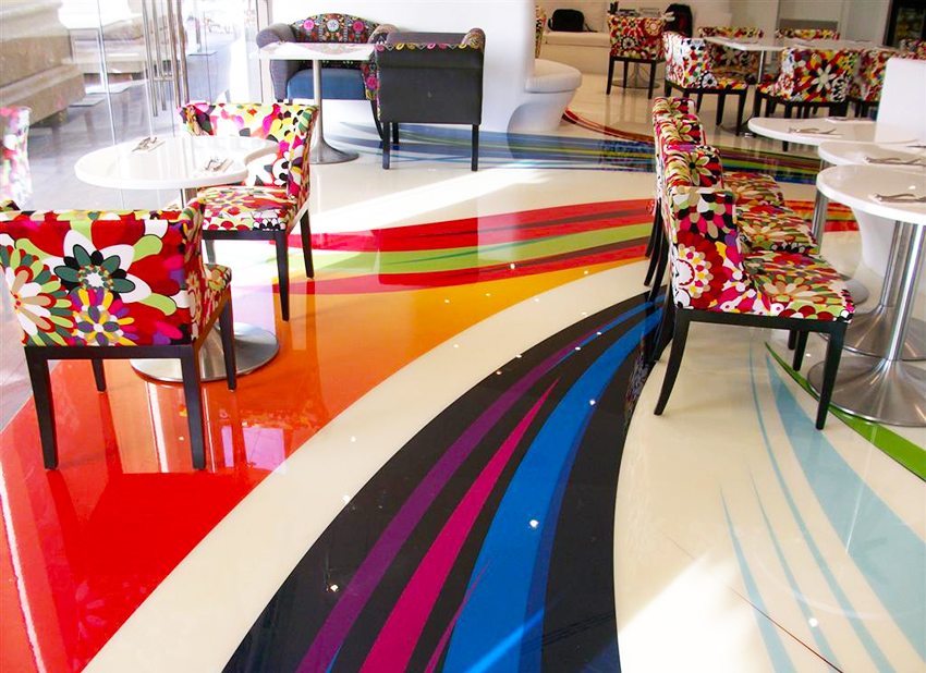 La pancarta terminada con una imagen está pegada al revestimiento autonivelante. La etapa final de las instrucciones paso a paso del piso autonivelante con sus propias manos será la aplicación de una capa de acabado sobre el dibujo. Se vierte una lente de plástico especial sobre la imagen terminada y se aplica una capa resistente al desgaste en la parte superior, lo que aumenta las propiedades operativas de la superficie. Si necesita un efecto óptico especial, muchas agencias de publicidad pueden solicitar una lente súper transparente especial.