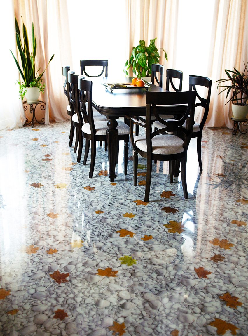 La opción más simple para un piso voluminoso son los objetos pequeños que se vierten en él, por ejemplo, guijarros, conchas o monedas. El segundo más difícil es la imagen fotorrealista. Lo más difícil es hacer una ilusión óptica en el suelo, pero la espectacularidad de un suelo así estará en su mejor momento.