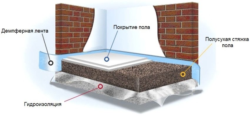 Sabiendo esto, es necesario resolver el problema de reducir la masa con un espesor de capa constante. Esto solo se puede hacer reduciendo la densidad de todo el monolito. El mejor material para este propósito es arcilla expandida, de la que está hecha la almohada. Encima, duerma y nivele la mezcla semiseca. La base de la mezcla semiseca está flotando. No se sujeta rígidamente ni a losas ni a las paredes. La regla se separa del piso con una capa de impermeabilización y de las paredes con una cinta amortiguadora en todo el perímetro. También evita la propagación de vibraciones sonoras del suelo a las paredes. Esta medida elimina el agrietamiento de la superficie de la regla cuando el mortero se seca.