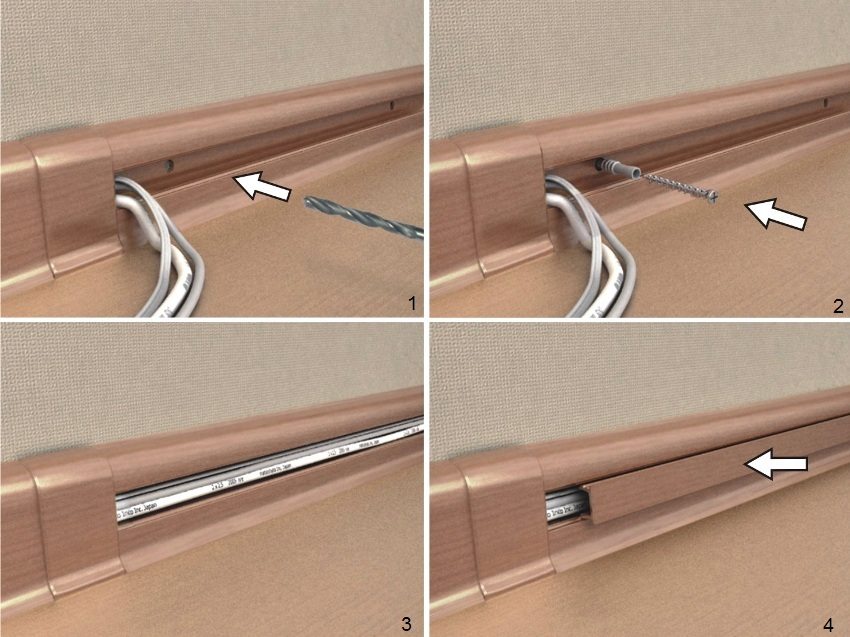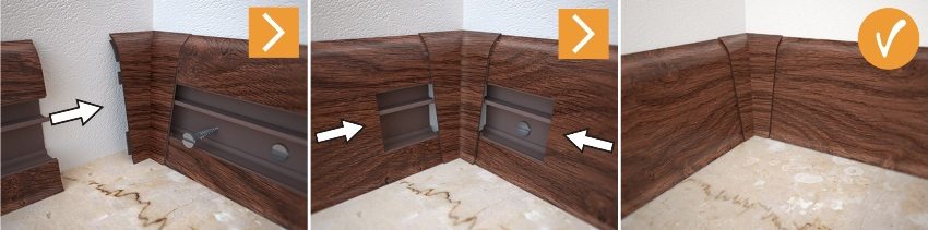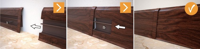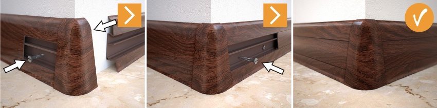 Dependiendo del tipo de perfil de suelo, hay varias formas de fijarlo. Los modelos sordos sin canales de cable se montan con pegamento o clips especiales. Si hay una ranura para cables, dicho producto se puede sujetar con tornillos o tacos autorroscantes.