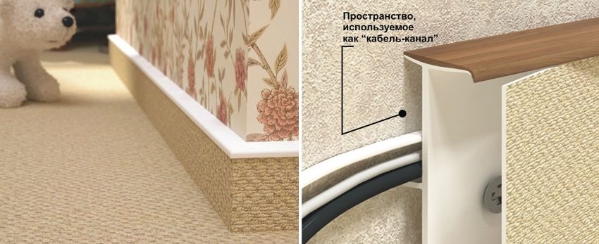 Los fabricantes ofrecen otro modelo que tiene un canal en la parte frontal. El borde inferior presiona la alfombra y se inserta una tira del mismo material que la alfombra en el espacio disponible. En este caso, hay un espacio entre la pared y el plástico, en el que puede colocar alambres y cables que interfieran.