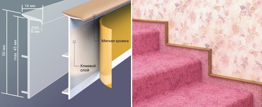 El rodapié ancho de plástico para suelo para moqueta está hecho de un perfil en forma de L. Se inserta una tira de tela en una ranura especial, lo que permite que la alfombra se fije firmemente.Algunas opciones de molduras para pisos vienen con una cinta adhesiva especial que mantiene el piso firmemente en su lugar. Se pueden utilizar productos similares para el acabado de suelos de linóleo.